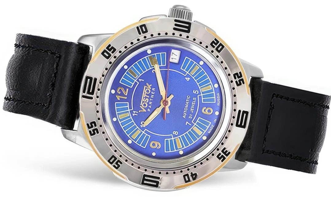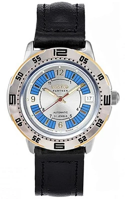 Мужские наручные часы Восток Партнер 31161А. Механические с ручным подзаводом. Ремешок изготовлен из кожи. Браслет из нержавеющей стали. Прочное, устойчивое к царапинам минеральное стекло защищает часы от повреждений. На циферблате отображается текущее число месяца. Часы являются водонепроницаемыми до 3 Бар. Цвет циферблата: Серебристый. Цвет циферблата: Желтое золото. Цвет корпуса: Синий. На стрелки и отметки нанесен светонакопительный состав, благодаря этому считывать информацию с циферблата возможно и в темноте. Толщина: 13 мм. Гарантия: 1 год.