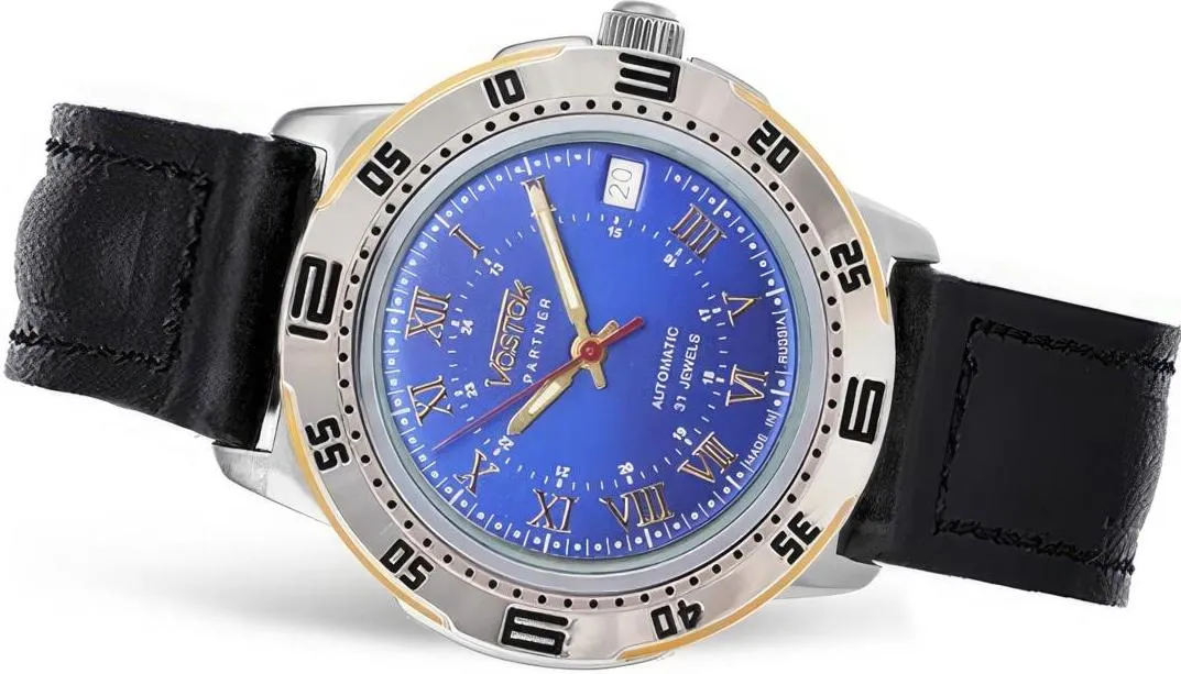Мужские наручные часы Восток Партнер 31164А. Механические с ручным подзаводом. Ремешок изготовлен из кожи. Браслет из нержавеющей стали. Прочное, устойчивое к царапинам минеральное стекло защищает часы от повреждений. На циферблате отображается текущее число месяца. Часы являются водонепроницаемыми до 3 Бар. Цвет циферблата: Серебристый. Цвет циферблата: Желтое золото. Цвет корпуса: Синий. На стрелки и отметки нанесен светонакопительный состав, благодаря этому считывать информацию с циферблата возможно и в темноте. Толщина: 12 мм. Гарантия: 1 год.