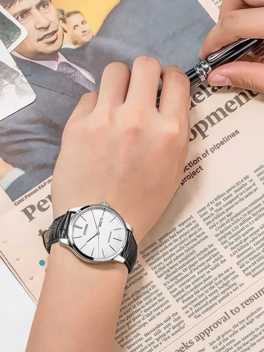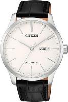 Мужские наручные часы Citizen Automatic NH8350-08B. Механические с автоподзаводом. Пружина механизма заводится автоматически благодаря естественным движениям владельца в процессе ежедневной носки часов. Ремешок изготовлен из кожи. Браслет из нержавеющей стали. Прочное, устойчивое к царапинам минеральное стекло защищает часы от повреждений. На циферблате отображается текущее число месяца и день недели. Часы являются водонепроницаемыми до 5 Бар. Цвет циферблата: Серебристый. Цвет корпуса: Белый. Толщина: 11 мм. Гарантия: 2 года.