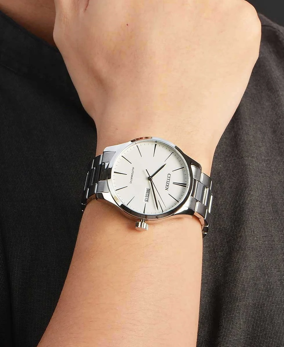 Мужские наручные часы Citizen Automatic NH8350-83A. Механические с автоподзаводом. Пружина механизма заводится автоматически благодаря естественным движениям владельца в процессе ежедневной носки часов. Браслет из нержавеющей стали. Браслет из нержавеющей стали. Прочное, устойчивое к царапинам минеральное стекло защищает часы от повреждений. На циферблате отображается текущее число месяца и день недели. Часы являются водонепроницаемыми до 5 Бар. Цвет циферблата: Серебристый. Цвет корпуса: Белый. Толщина: 11 мм. Гарантия: 2 года.