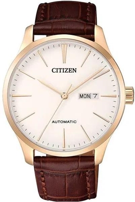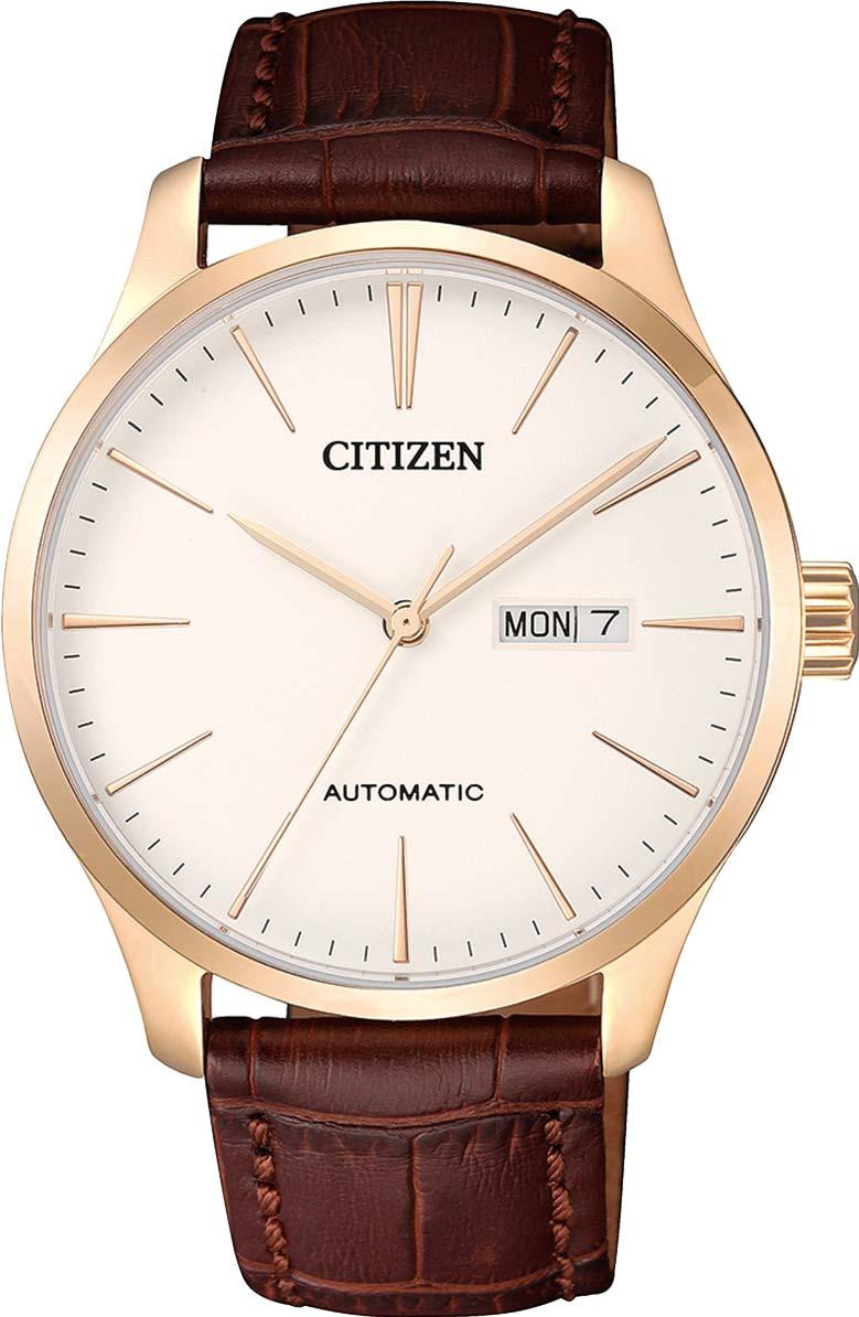 Мужские наручные часы Citizen Automatic NH8353-18A. Механические с ручным подзаводом. Ремешок изготовлен из кожи. Браслет из нержавеющей стали. Прочное, устойчивое к царапинам минеральное стекло защищает часы от повреждений. На циферблате отображается текущее число месяца и день недели. Часы являются водонепроницаемыми до 5 Бар. Цвет циферблата: Розовое золото. Цвет корпуса: Бежевый. Толщина: 10 мм. Гарантия: 2 года.