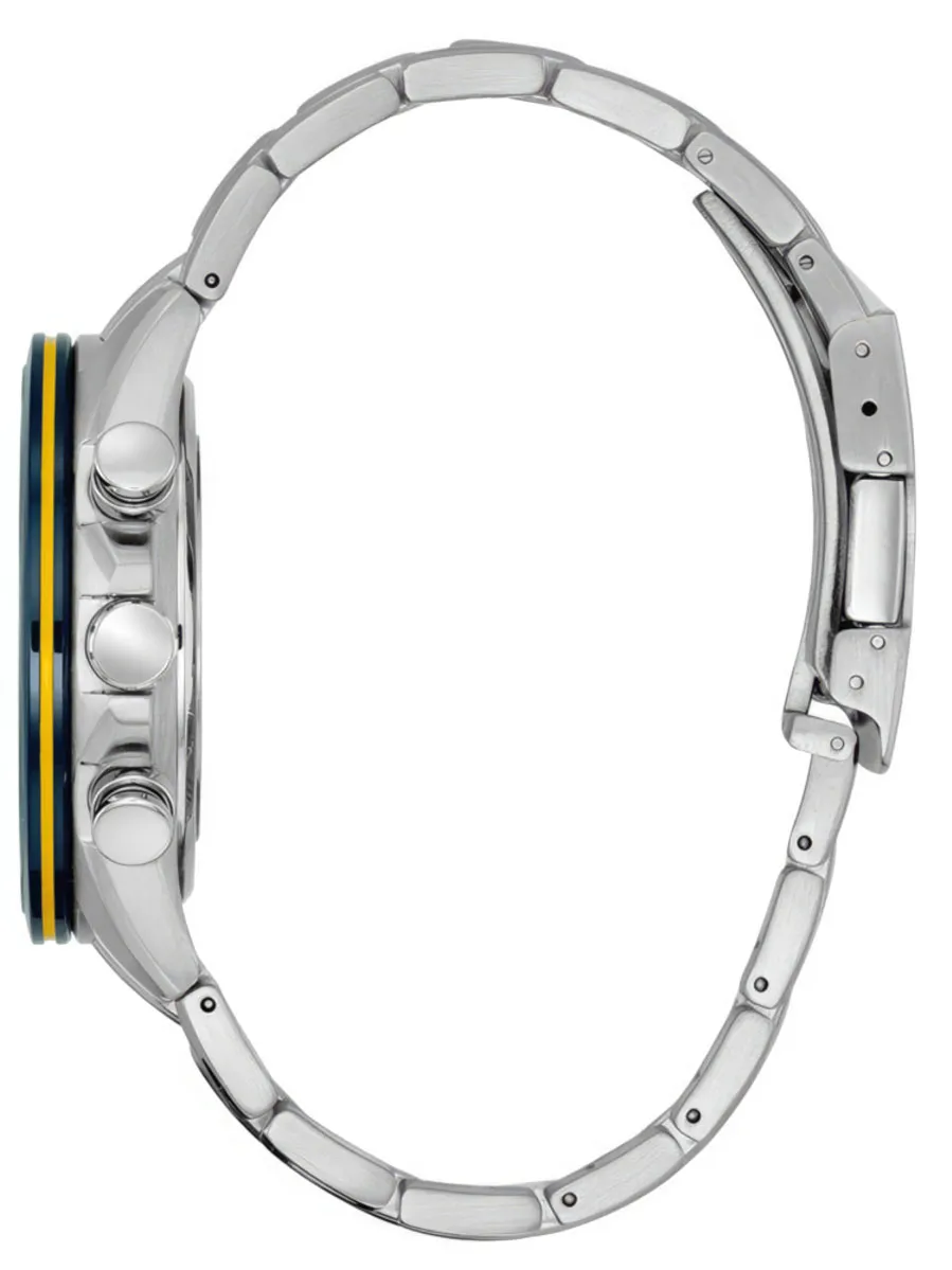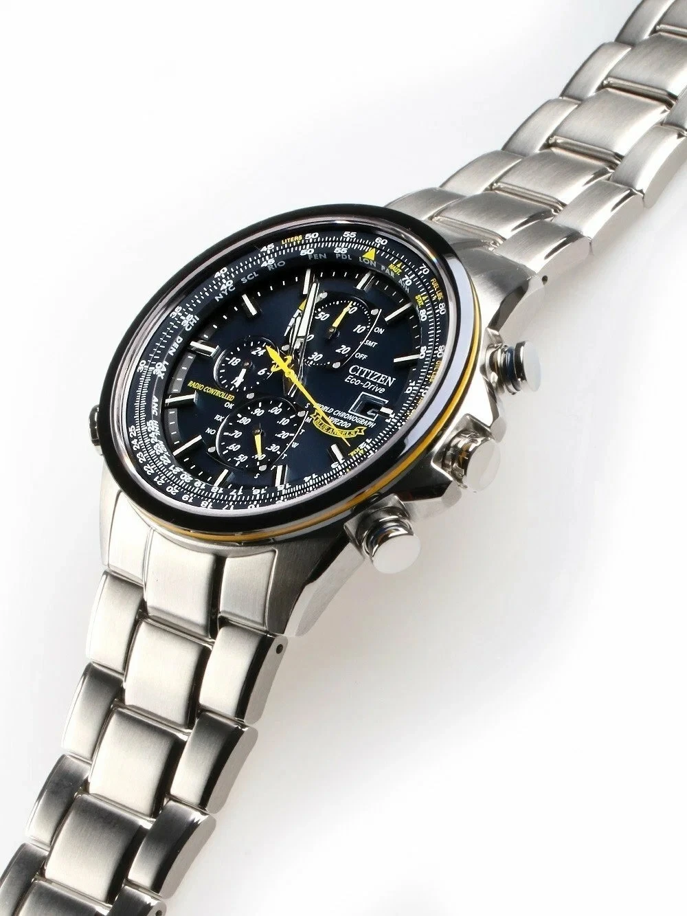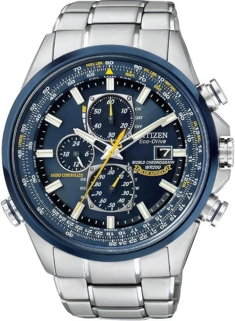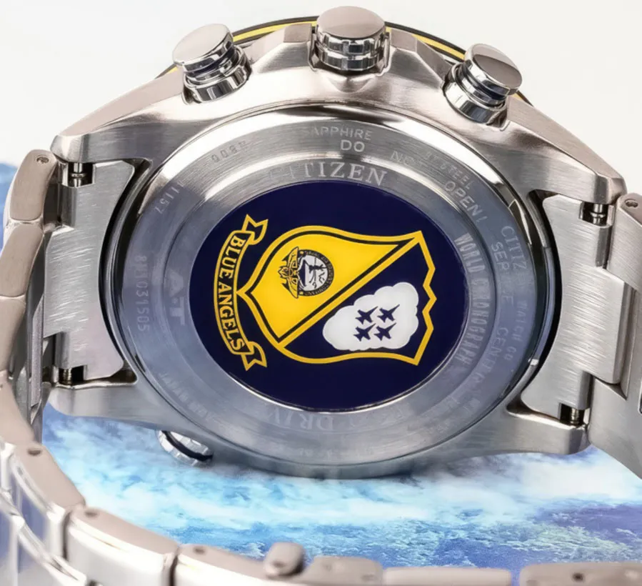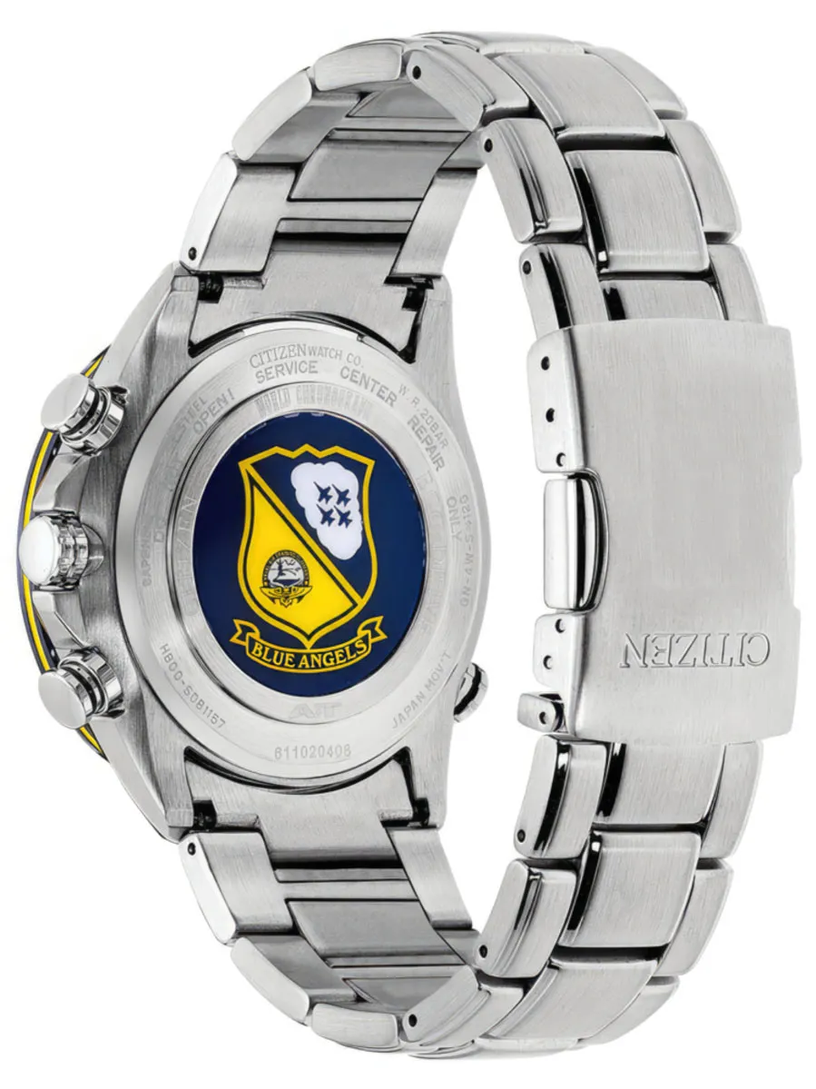 Японские часы Promaster Sky в честь авиационной группы Blue Angels. Корпус и браслет из нерж. стали. Сапфировое стекло. Многофункциональный механизм Eco-Drive. Коррекция времени по радиосигналам, хронограф, мировое время и вечный календарь.