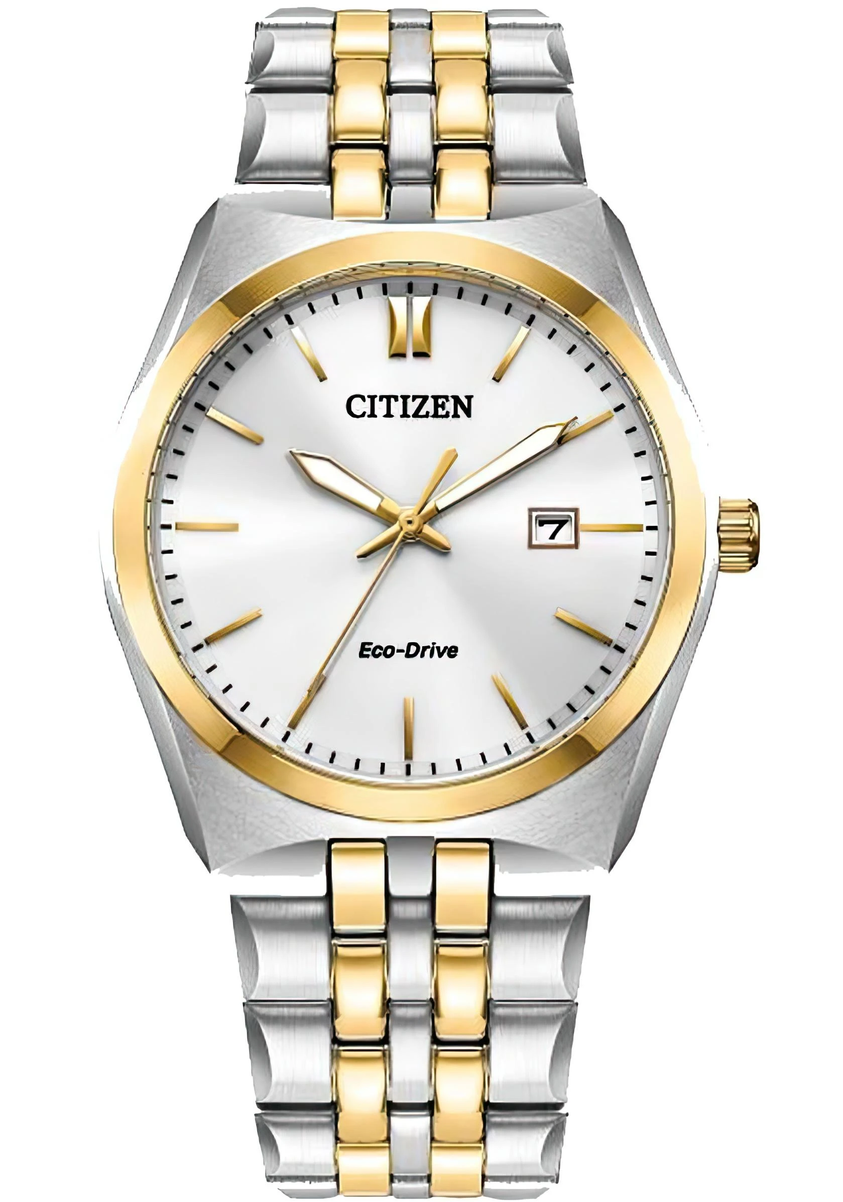 Мужские наручные часы Citizen Eco Drive BM7334-58B. Точный кварцевый механизм с аналоговой индикацией. Браслет из нержавеющей стали. Солнечная батарейка. Солнечная подзаряжающаяся батарейка обеспечивает питание часов для работы. Браслет из нержавеющей стали. Прочное, устойчивое к царапинам минеральное стекло защищает часы от повреждений. На циферблате отображается текущее число месяца. Часы являются водонепроницаемыми до 10 Бар. Цвет циферблата: Серебристый. Цвет циферблата: Желтое золото. Цвет корпуса: Серебристый. На стрелки и отметки нанесен светонакопительный состав, благодаря этому считывать информацию с циферблата возможно и в темноте. Толщина: 11 мм. Гарантия: 2 года.