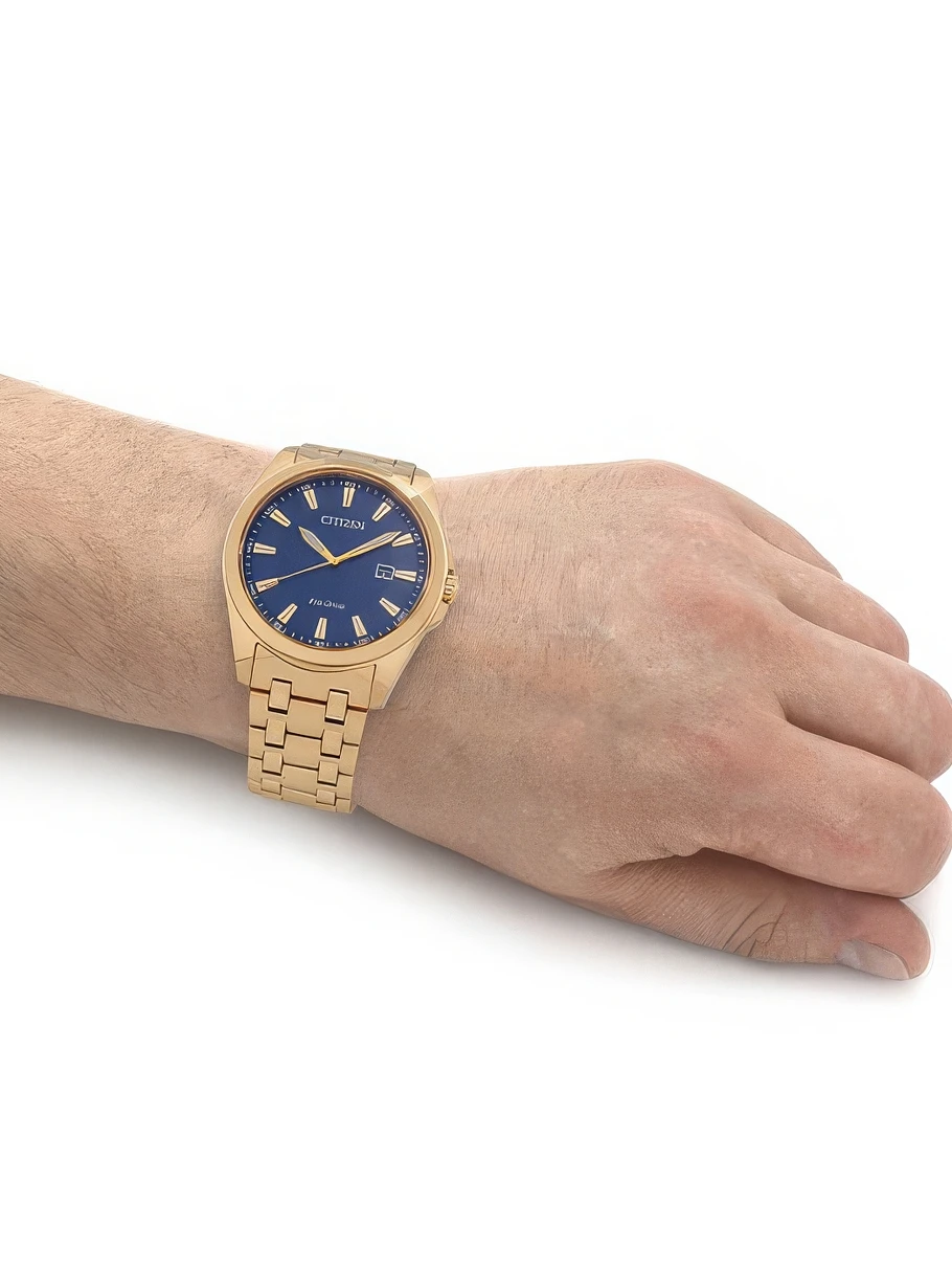 Мужские наручные часы Citizen Eco Drive BM7532-54L. Точный кварцевый механизм с аналоговой индикацией. Браслет из нержавеющей стали. Солнечная батарейка. Солнечная подзаряжающаяся батарейка обеспечивает питание часов для работы. Браслет из нержавеющей стали. Сапфировое стекло. Искусственно изготовленное стекло с высокой прочностью и устойчивостью к царапинам. На циферблате отображается текущее число месяца. Часы являются водонепроницаемыми до 10 Бар. Цвет циферблата: Желтое золото. Цвет корпуса: Синий. На стрелки и отметки нанесен светонакопительный состав, благодаря этому считывать информацию с циферблата возможно и в темноте. Толщина: 9 мм. Гарантия: 2 года.
