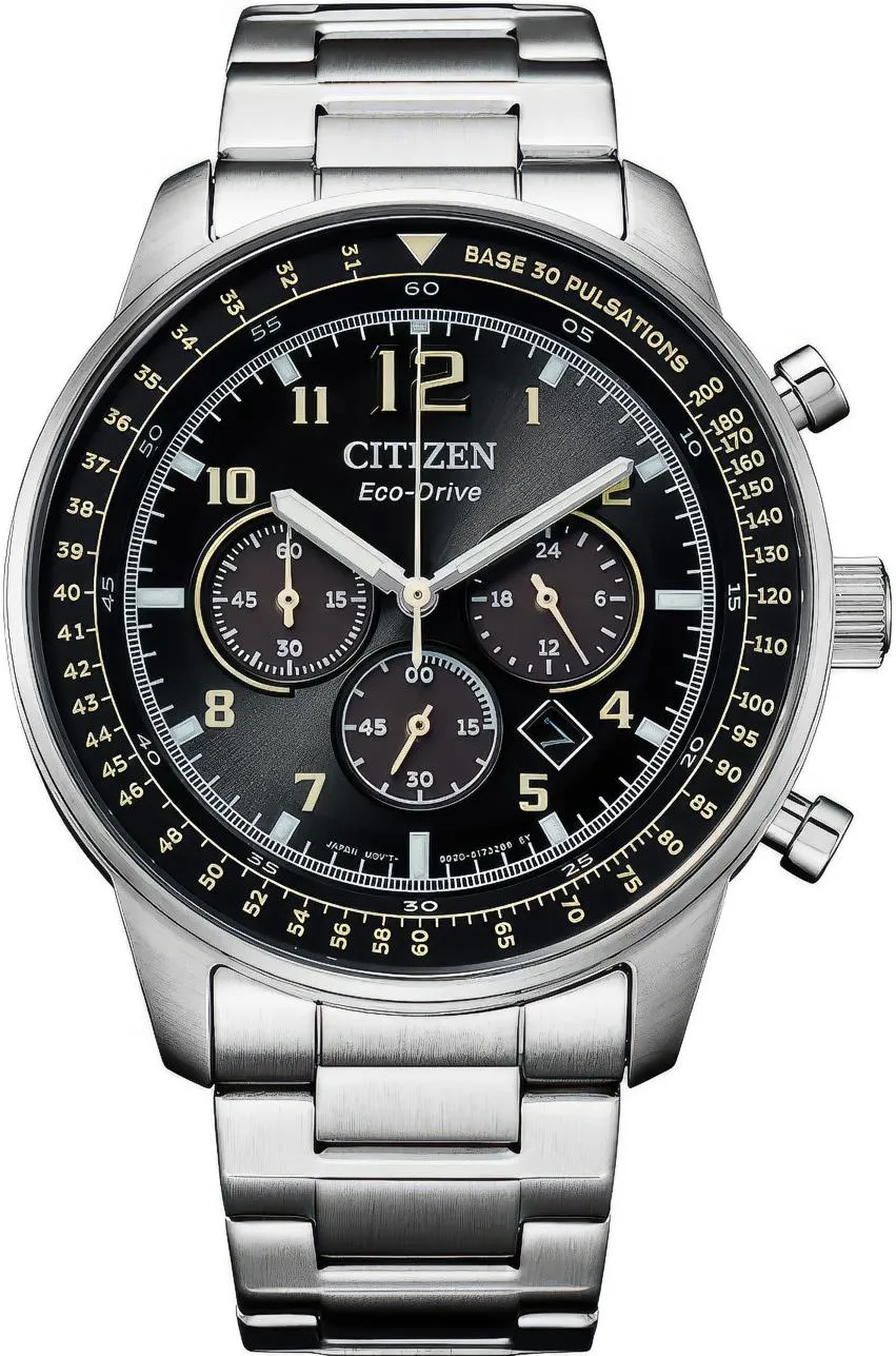 Мужские наручные часы Citizen Eco Drive CA4500-83E. Точный кварцевый механизм с аналоговой индикацией. Корпус изготовлен из высококачественной нержавеющей стали 316L с высокими антикоррозийными свойствами. На стрелки и отметки нанесен светонакопительный состав, благодаря этому считывать информацию с циферблата возможно и в темноте. На циферблате отображается текущее число месяца. Солнечная батарейка. Солнечная подзаряжающаяся батарейка обеспечивает питание часов для работы. Функция хронографа. Отображение времени возможно в 12-часовом или 24-часовом формате. Браслет из нержавеющей стали. Прочное, устойчивое к царапинам минеральное стекло защищает часы от повреждений. Часы являются водонепроницаемыми до 10 Бар. Цвет корпуса: Серебристый. Цвет циферблата: Черный. Ширина (с заводной головкой): 44мм. Толщина: 12мм. Гарантия: 2 года.