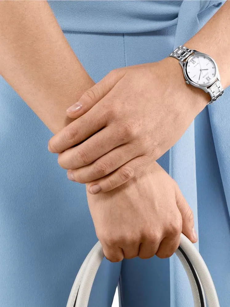 Женские кварцевые часы на солнечной батарее. Запас хода при полной зарядке 180 дней. Центральные часовая, минутная и секундная стрелки. Серебристый циферблат. Круглый корпус выполнен из матовой нержавеющей стали. Диаметр корпуса составляет 32 мм, толщина 7,6 мм. Стальной браслет шириной 14 мм, раскладывающаяся застежка. Прочное минеральное стекло устойчивое к мелким механическим повреждениям. Водостойкость WR 50 (мытье рук, дождь).