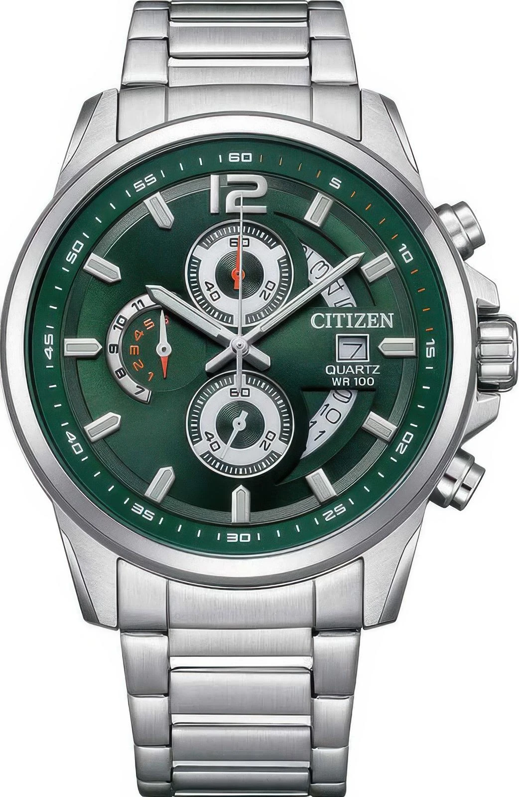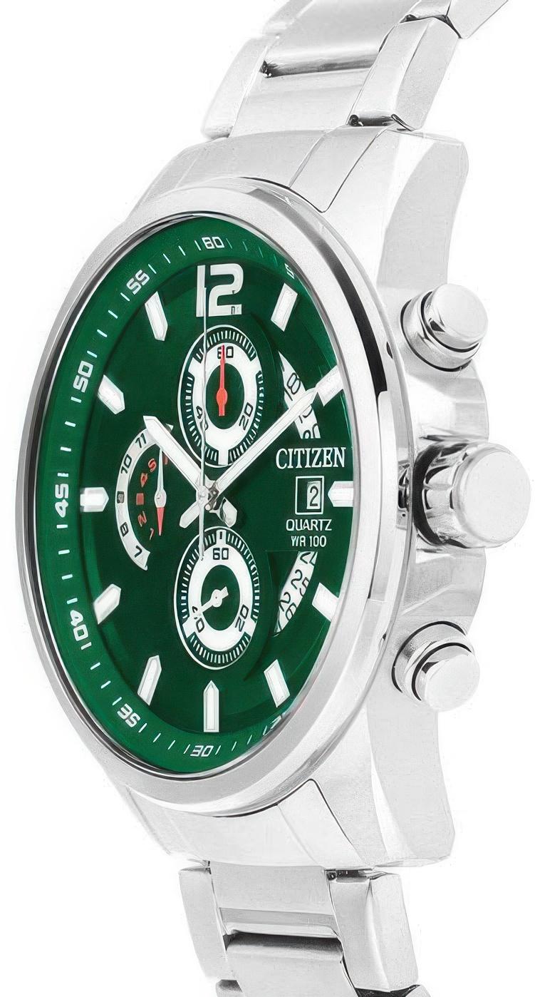 Мужские наручные часы Citizen Quartz AN3690-56X. Точный кварцевый механизм с аналоговой индикацией. Браслет из нержавеющей стали. Функция хронографа. Браслет из нержавеющей стали. Прочное, устойчивое к царапинам минеральное стекло защищает часы от повреждений. На циферблате отображается текущее число месяца. Часы являются водонепроницаемыми до 10 Бар. Цвет циферблата: Зеленый. Цвет циферблата: Серебристый. Цвет корпуса: Зеленый. На стрелки и отметки нанесен светонакопительный состав, благодаря этому считывать информацию с циферблата возможно и в темноте. Толщина: 12 мм. Гарантия: 2 года.