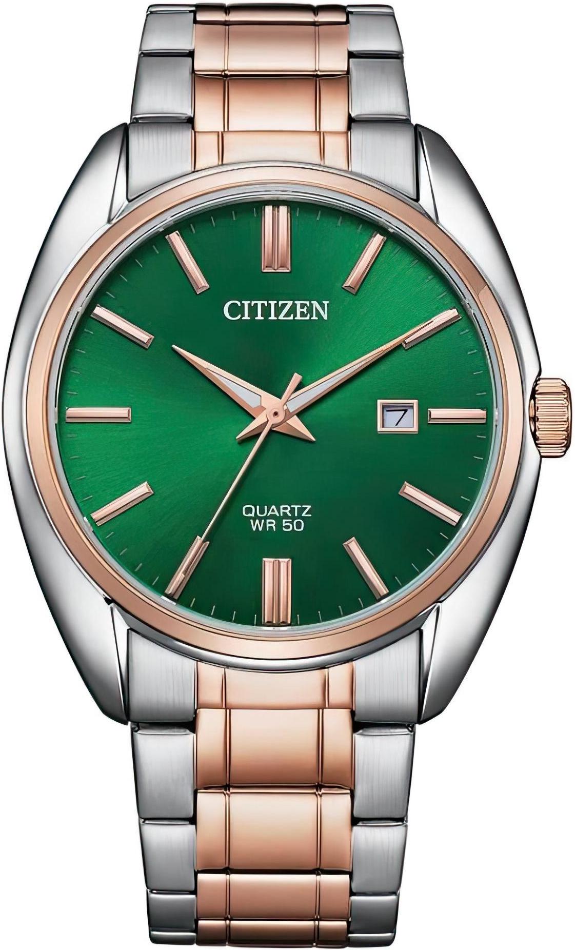Мужские наручные часы Citizen Quartz BI5104-57Z. Точный кварцевый механизм с аналоговой индикацией. Браслет из нержавеющей стали. Аккумулятор обеспечивает часы достаточным питанием приблизительно на 2 года. Браслет из нержавеющей стали. Прочное, устойчивое к царапинам минеральное стекло защищает часы от повреждений. На циферблате отображается текущее число месяца. Часы являются водонепроницаемыми до 5 Бар. Цвет циферблата: Серебристый. Цвет циферблата: Розовое золото. Цвет корпуса: Зеленый. На стрелки и отметки нанесен светонакопительный состав, благодаря этому считывать информацию с циферблата возможно и в темноте. Толщина: 9 мм. Гарантия: 2 года.
