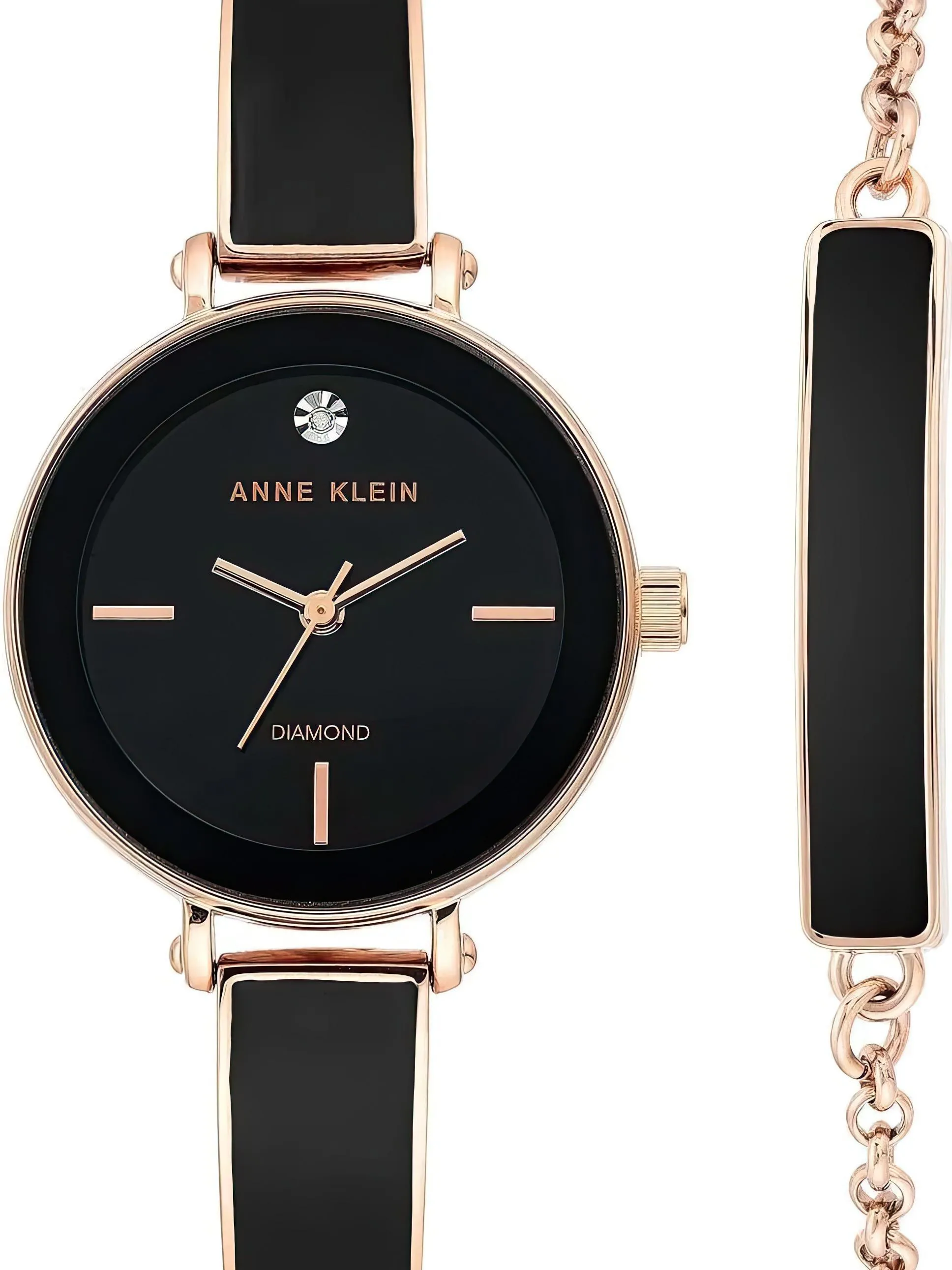 • В комплекте металлический браслет с PVD покрытием цвета розового золота и эмалью черного цвета.