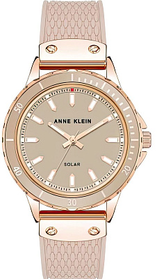 Женские наручные часы Anne Klein Plastic 3890RGBH. Точный кварцевый механизм с аналоговой индикацией. Полимерный ремешок. Натуральный полимерный материал является идеальным для изготовления ремешка благодаря своей чрезвычайной прочности и гибкости. Солнечная батарейка. Солнечная подзаряжающаяся батарейка обеспечивает питание часов для работы. Браслет из нержавеющей стали. Прочное, устойчивое к царапинам минеральное стекло защищает часы от повреждений. Часы являются водонепроницаемыми до 3 Бар. Цвет циферблата: Бежевый. Цвет циферблата: Розовое золото. Цвет корпуса: Бежевый. На стрелки и отметки нанесен светонакопительный состав, благодаря этому считывать информацию с циферблата возможно и в темноте. Толщина: 11 мм. Гарантия: 2 года.