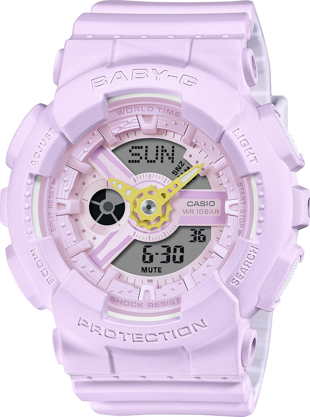 Женские кварцевые часы. Подсветка. Центральные часовая и минутная стрелки. Функция мирового времени — 29 часовых зон (48 городов). Секундомер с точностью 1/100 секунды и пределом измерения 24 часа. Таймер. 5 ежедневных будильника, один из них с функцией повтора будильника. Автоматический календарь. Ежечасный сигнал. 12/24х часовой формат времени. Включение/выключение звука кнопок. Светло-фиолетовый циферблат. Ударопрочный круглый корпус выполнен из полимерного материала светло-фиолетового цвета. Размер корпуса составляет 43 х 46 х 16 мм. Ремешок выполнен из полимерного материала, стандартная застежка. Прочное минеральное стекло, устойчивое к мелким механическим повреждениям. Водостойкость WR 100 (плавание без погружения).