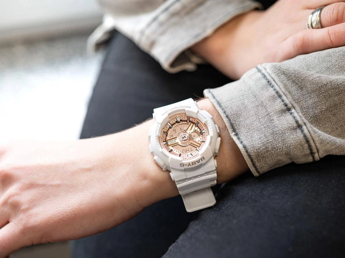 Женские наручные часы Casio Baby-G BA-110X-7A1. Точный кварцевый механизм с аналого-цифровой индикацией. Полимерный ремешок. Натуральный полимерный материал является идеальным для изготовления ремешка благодаря своей чрезвычайной прочности и гибкости. После настройки автоматический календарь всегда отображает точную дату. Аккумулятор обеспечивает часы достаточным питанием приблизительно на 2 года. Функция будильника. Функция хронографа. Отображение текущего времени в основных городах и конкретных областях по всему миру. Функция таймера. Таймеры обратного отсчета напомнят Вам о текущих или особенных событиях, издав звуковой сигнал в установленное время. Ударопрочная конструкция часов защищает от ударов и вибрации. Отображение времени возможно в 12-часовом или 24-часовом формате. Полимерный ремешок. Натуральный полимерный материал является идеальным для изготовления ремешка благодаря своей чрезвычайной прочности и гибкости. Прочное, устойчивое к царапинам минеральное стекло защищает часы от повреждений. На циферблате отображается текущее число, месяц и день недели. Часы являются водонепроницаемыми до 10 Бар. Цвет циферблата: Белый. Цвет корпуса: Золотистый. Светодиодная подсветка. Толщина: 16 мм. Гарантия: 2 года.