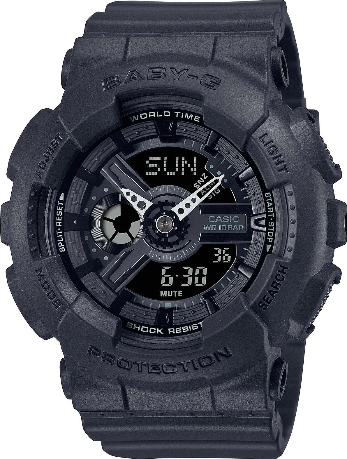 Женские наручные часы Casio Baby-G BA-110XBC-1A. Точный кварцевый механизм с аналого-цифровой индикацией. Полимерный ремешок. Натуральный полимерный материал является идеальным для изготовления ремешка благодаря своей чрезвычайной прочности и гибкости. После настройки автоматический календарь всегда отображает точную дату. Аккумулятор обеспечивает часы достаточным питанием приблизительно на 2 года. Функция будильника. Функция хронографа. Отображение текущего времени в основных городах и конкретных областях по всему миру. Функция таймера. Таймеры обратного отсчета напомнят Вам о текущих или особенных событиях, издав звуковой сигнал в установленное время. Ударопрочная конструкция часов защищает от ударов и вибрации. Отображение времени возможно в 12-часовом или 24-часовом формате. Полимерный ремешок. Натуральный полимерный материал является идеальным для изготовления ремешка благодаря своей чрезвычайной прочности и гибкости. Прочное, устойчивое к царапинам минеральное стекло защищает часы от повреждений. На циферблате отображается текущее число, месяц и день недели. Часы являются водонепроницаемыми до 10 Бар. Цвет циферблата: Черный. Цвет корпуса: Черный. Светодиодная подсветка. На стрелки и отметки нанесен светонакопительный состав, благодаря этому считывать информацию с циферблата возможно и в темноте. Толщина: 16 мм. Гарантия: 2 года.
