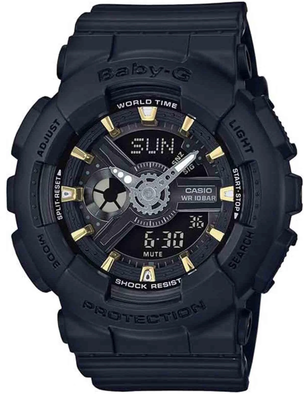 Мужские наручные часы Casio Baby-G BA-110XGA-1A. Точный кварцевый механизм с аналого-цифровой индикацией. Полимерный корпус надежно защищает часы от механических повреждений. Светодиодная подсветка. На циферблате отображается текущее число, месяц и день недели. Ударопрочная конструкция часов защищает от ударов и вибрации. Функция хронографа. Функция таймера. Таймеры обратного отсчета напомнят Вам о текущих или особенных событиях, издав звуковой сигнал в установленное время. Функция будильника. Аккумулятор обеспечивает часы достаточным питанием приблизительно на 2 года. Отображение текущего времени в основных городах и конкретных областях по всему миру. После настройки автоматический календарь всегда отображает точную дату. Отображение времени возможно в 12-часовом или 24-часовом формате. Полимерный ремешок. Натуральный полимерный материал является идеальным для изготовления ремешка благодаря своей чрезвычайной прочности и гибкости. Прочное, устойчивое к царапинам минеральное стекло защищает часы от повреждений.Часы являются водонепроницаемыми до 10 Бар. Цвет корпуса: Черный. Цвет циферблата: Черный. Ширина (с заводной головкой): 46мм. Толщина: 16мм. Гарантия: 2 года.