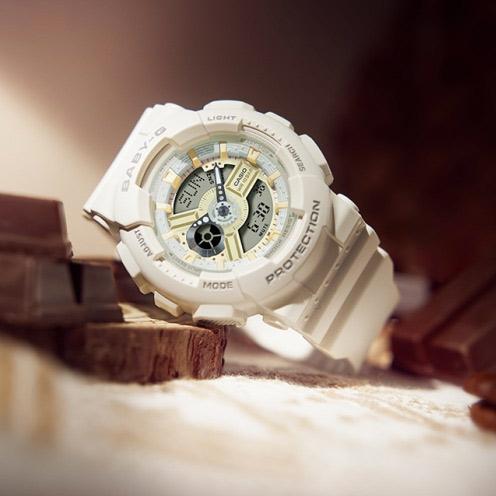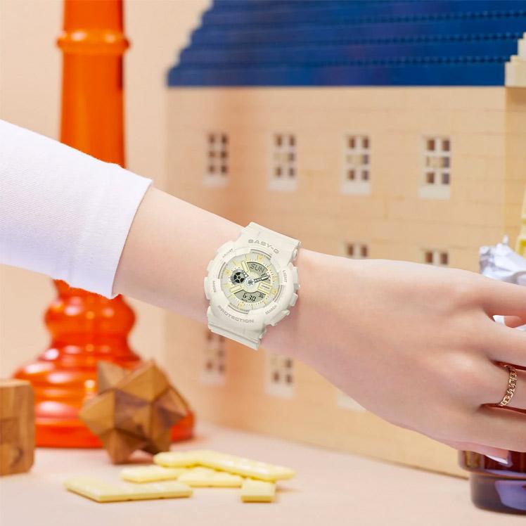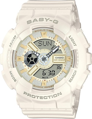 Женские наручные часы Casio Baby-G BA-110XSW-7A. Точный кварцевый механизм с аналого-цифровой индикацией. Полимерный ремешок. Натуральный полимерный материал является идеальным для изготовления ремешка благодаря своей чрезвычайной прочности и гибкости. После настройки автоматический календарь всегда отображает точную дату. Аккумулятор обеспечивает часы достаточным питанием приблизительно на 2 года. Функция будильника. Функция хронографа. Отображение текущего времени в основных городах и конкретных областях по всему миру. Функция таймера. Таймеры обратного отсчета напомнят Вам о текущих или особенных событиях, издав звуковой сигнал в установленное время. Ударопрочная конструкция часов защищает от ударов и вибрации. Отображение времени возможно в 12-часовом или 24-часовом формате. Полимерный ремешок. Натуральный полимерный материал является идеальным для изготовления ремешка благодаря своей чрезвычайной прочности и гибкости. Прочное, устойчивое к царапинам минеральное стекло защищает часы от повреждений. На циферблате отображается текущее число, месяц и день недели. Часы являются водонепроницаемыми до 10 Бар. Цвет циферблата: Белый. Цвет корпуса: Белый. Светодиодная подсветка. На стрелки и отметки нанесен светонакопительный состав, благодаря этому считывать информацию с циферблата возможно и в темноте. Толщина: 16 мм. Гарантия: 2 года.