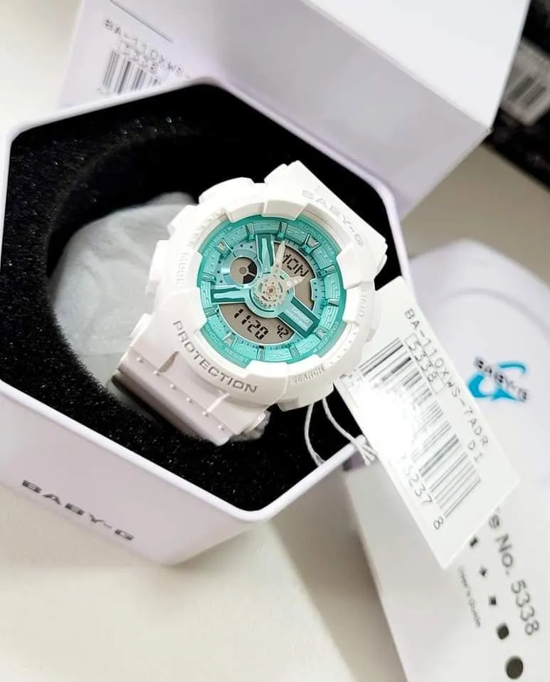 Женские наручные часы Casio Baby-G BA-110XWS-7A. Точный кварцевый механизм с аналого-цифровой индикацией. Полимерный корпус надежно защищает часы от механических повреждений. Светодиодная подсветка. Ударопрочная конструкция часов защищает от ударов и вибрации. Функция таймера. Таймеры обратного отсчета напомнят Вам о текущих или особенных событиях, издав звуковой сигнал в установленное время. Для подсветки дисплея используется светодиод, а так же имеет функцию автоматического включения подсветки, если Вы наклоните часы к своему лицу. Ежечасный сигнал. Функция будильника. После настройки автоматический календарь всегда отображает точную дату. Отображение времени возможно в 12-часовом или 24-часовом формате. Полимерный ремешок. Натуральный полимерный материал является идеальным для изготовления ремешка благодаря своей чрезвычайной прочности и гибкости. Прочное, устойчивое к царапинам минеральное стекло защищает часы от повреждений. Часы являются водонепроницаемыми до 10 Бар. Цвет корпуса: Белый. Цвет циферблата: Черный. Ширина (с заводной головкой): 43мм. Толщина: 16мм. Гарантия: 2 года.