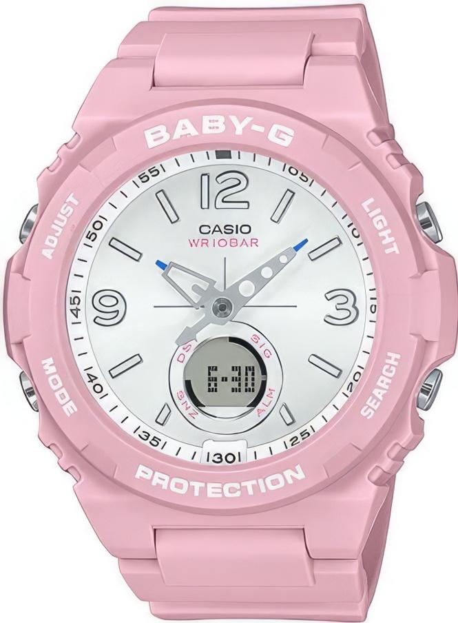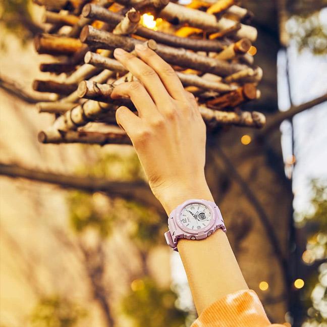 Модель идеально подходит под образ для осеннего фестиваля или глемпинга, имея спокойные оттенки с винтажным мотивом. Часы выполнены в персиковом цвете с белым циферблатом (BGA-260-4). Часовые стрелки модели имеют необритовое покрытие на кончике, стрелка светится будто светлячок в темноте.