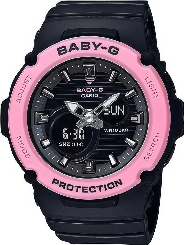 Женские наручные часы Casio Baby-G BGA-270-1A. Точный кварцевый механизм с аналого-цифровой индикацией. Полимерный ремешок. Натуральный полимерный материал является идеальным для изготовления ремешка благодаря своей чрезвычайной прочности и гибкости. После настройки автоматический календарь всегда отображает точную дату. Аккумулятор обеспечивает часы достаточным питанием приблизительно на 3 года. Функция будильника. Функция хронографа. Отображение текущего времени в основных городах и конкретных областях по всему миру. Функция таймера. Таймеры обратного отсчета напомнят Вам о текущих или особенных событиях, издав звуковой сигнал в установленное время. Ударопрочная конструкция часов защищает от ударов и вибрации. Отображение времени возможно в 12-часовом или 24-часовом формате. Полимерный ремешок. Натуральный полимерный материал является идеальным для изготовления ремешка благодаря своей чрезвычайной прочности и гибкости. Прочное, устойчивое к царапинам минеральное стекло защищает часы от повреждений. На циферблате отображается текущее число, месяц и день недели. Часы являются водонепроницаемыми до 10 Бар. Цвет циферблата: Черный. Цвет циферблата: Розовое золото. Цвет корпуса: Черный. Светодиодная подсветка. На стрелки и отметки нанесен светонакопительный состав, благодаря этому считывать информацию с циферблата возможно и в темноте. Толщина: 13 мм. Гарантия: 2 года.