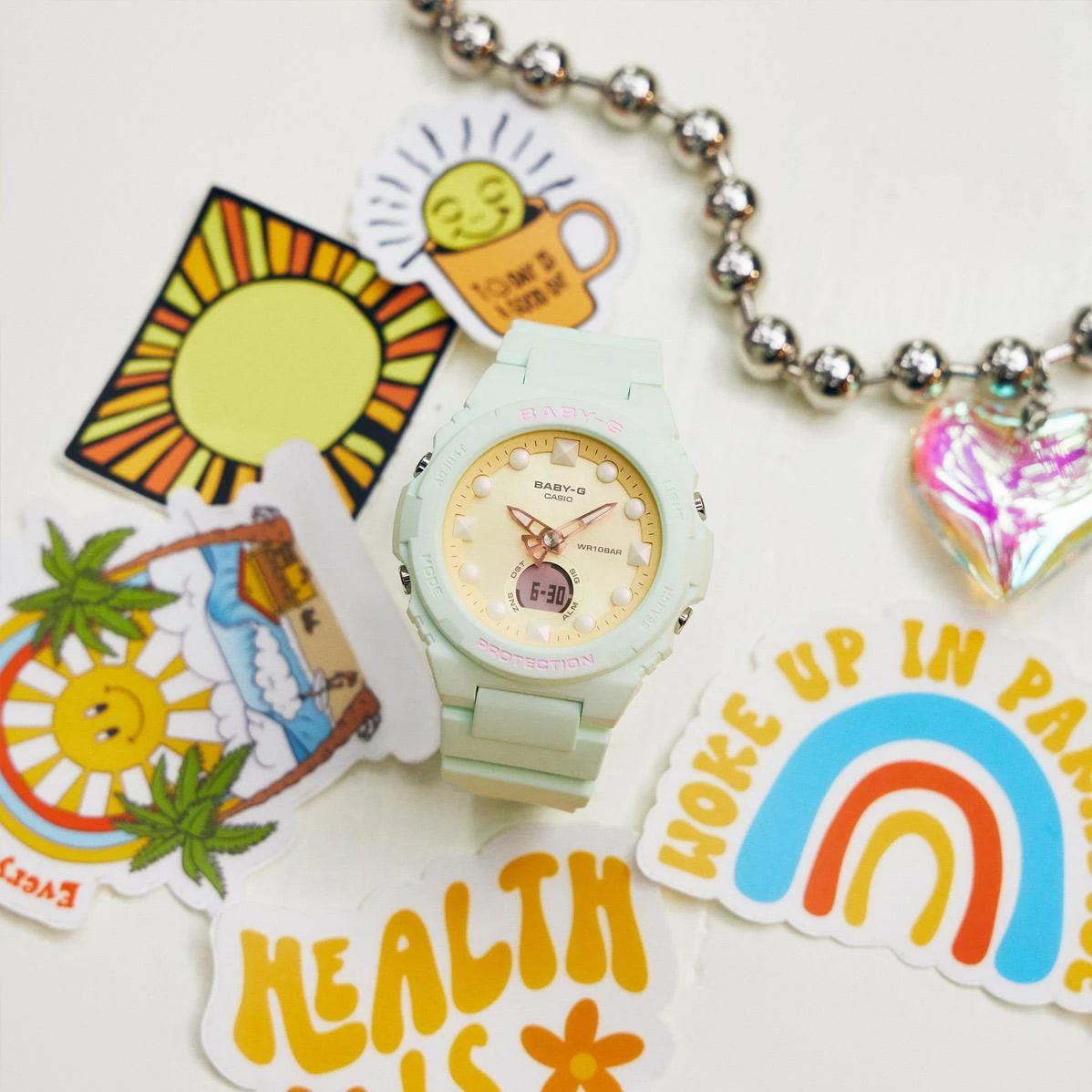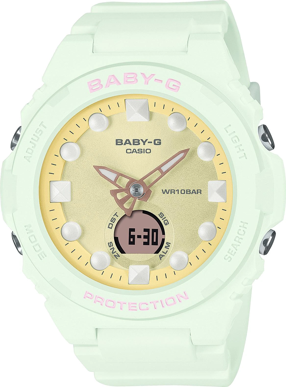 Женские наручные часы Casio Baby-G BGA-320FH-3A. Точный кварцевый механизм с аналого-цифровой индикацией. Браслет из нержавеющей стали. После настройки автоматический календарь всегда отображает точную дату. Для подсветки дисплея используется светодиод, а так же имеет функцию автоматического включения подсветки, если Вы наклоните часы к своему лицу. Функция будильника. Функция хронографа. Отображение текущего времени в основных городах и конкретных областях по всему миру. Функция таймера. Таймеры обратного отсчета напомнят Вам о текущих или особенных событиях, издав звуковой сигнал в установленное время. Ударопрочная конструкция часов защищает от ударов и вибрации. Отображение времени возможно в 12-часовом или 24-часовом формате. Браслет из нержавеющей стали. Прочное, устойчивое к царапинам минеральное стекло защищает часы от повреждений. На циферблате отображается текущее число месяца и день недели. Часы являются водонепроницаемыми до 10 Бар. Цвет циферблата: Голубой. Цвет корпуса: Желтый. Светодиодная подсветка. Высота (с ушками): 46 мм. Толщина: 12 мм. Гарантия: 2 года.