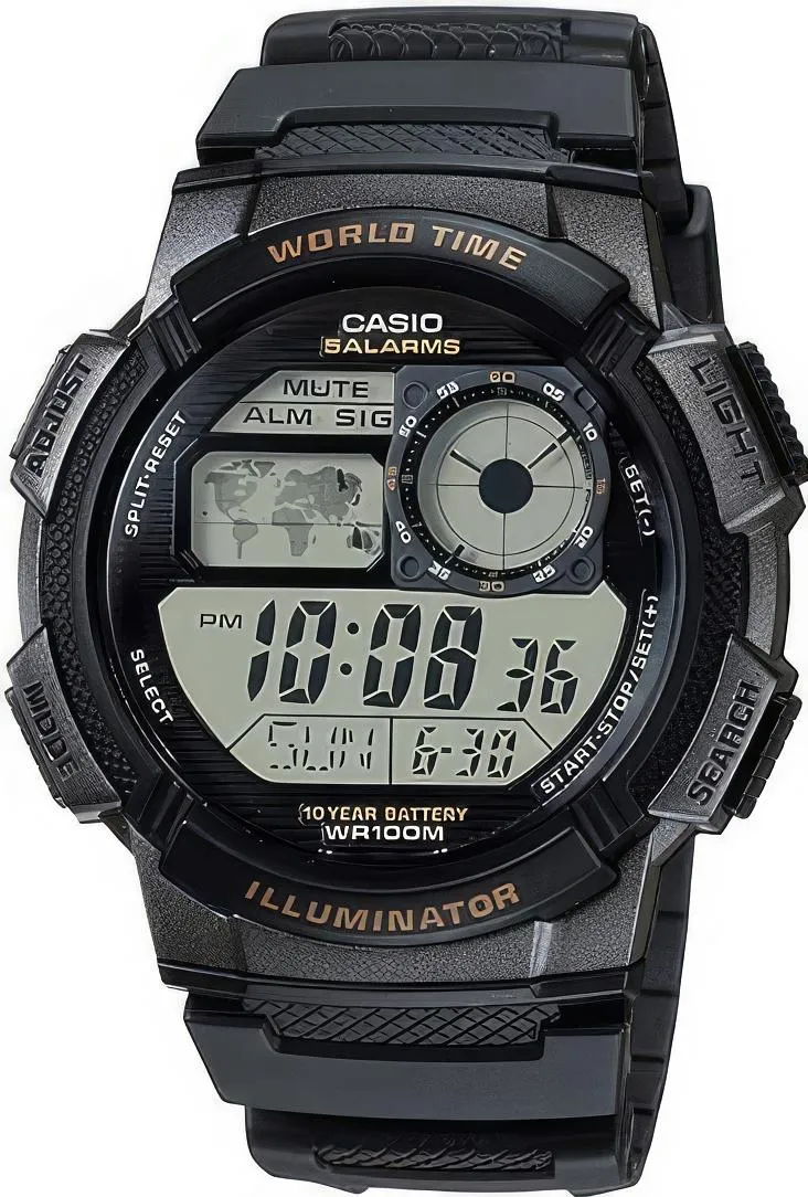 Многофункциональные часы с цифровой индикацией для активного отдыха. Надежные и недорогие. Прочный пластиковый корпус, водостойкость до 100 метров. Японский кварцевый механизм, батарея со сроком службы 10 лет, яркая светодиодная подсветка.