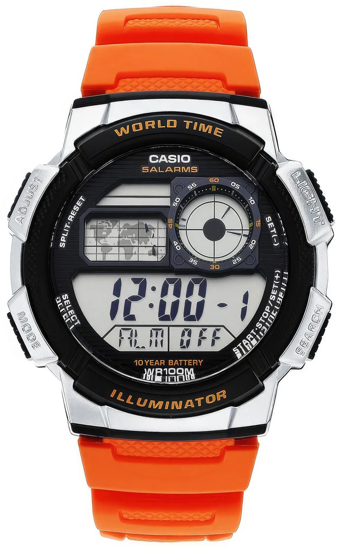 Многофункциональные часы с цифровой индикацией для активного отдыха. Надежные и недорогие. Прочный пластиковый корпус, водостойкость до 100 метров. Японский кварцевый механизм, батарея со сроком службы 10 лет, яркая светодиодная подсветка.