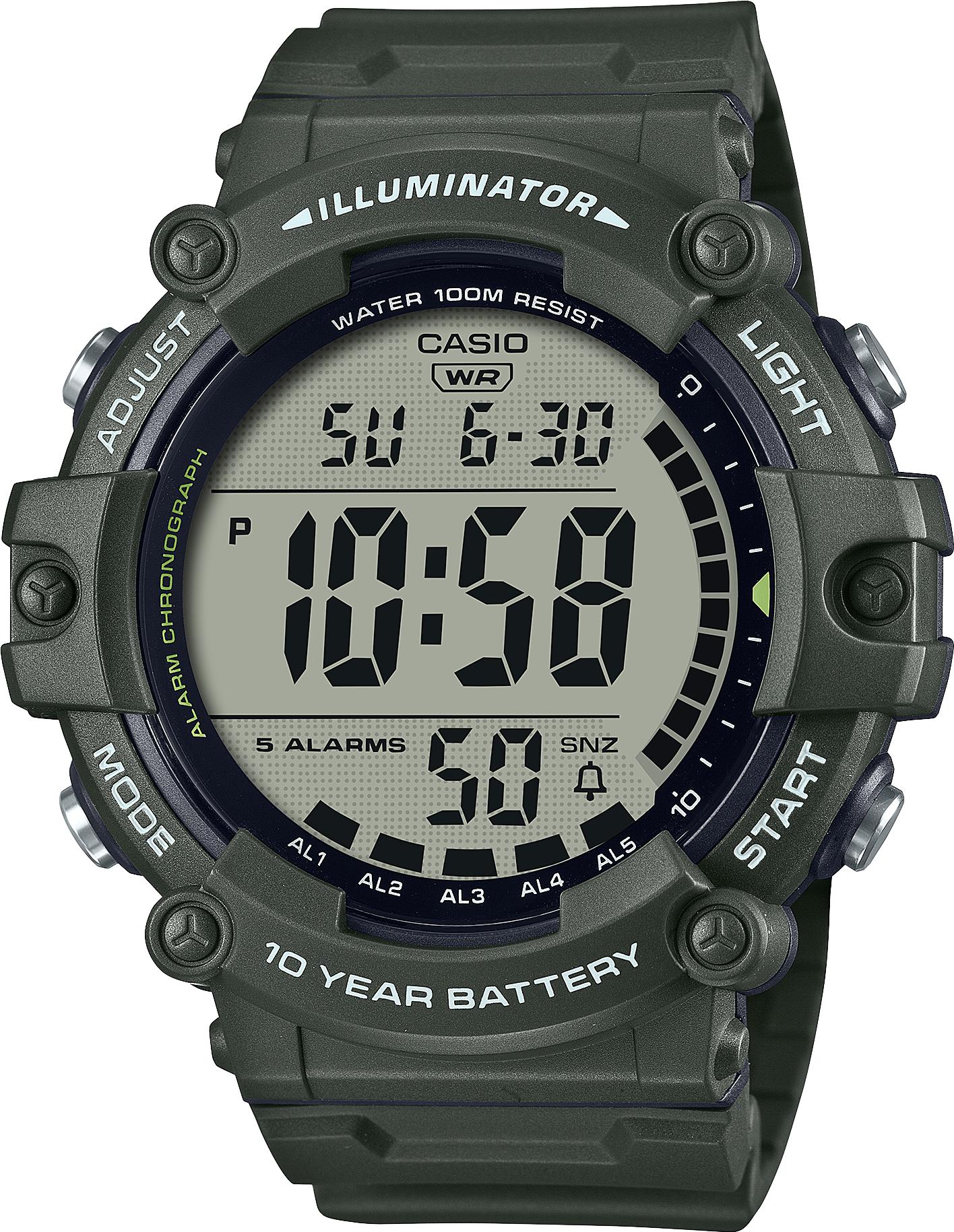 Мужские наручные часы Casio Collection AE-1500WHX-3A. Точный кварцевый механизм с цифровой индикацией. Полимерный корпус надежно защищает часы от механических повреждений. Светодиодная подсветка. На циферблате отображается текущее число, месяц и день недели. Ударопрочная конструкция часов защищает от ударов и вибрации. Функция хронографа. Функция таймера. Таймеры обратного отсчета напомнят Вам о текущих или особенных событиях, издав звуковой сигнал в установленное время. Аккумулятор обеспечивает часы достаточным питанием приблизительно на 10 лет. После настройки автоматический календарь всегда отображает точную дату. Отображение времени возможно в 12-часовом или 24-часовом формате. Полимерный ремешок. Натуральный полимерный материал является идеальным для изготовления ремешка благодаря своей чрезвычайной прочности и гибкости. Органическое стекло. Часы являются водонепроницаемыми до 10 Бар. Цвет корпуса: Зеленый. Цвет циферблата: Черный. Ширина (с заводной головкой): 54мм. Толщина: 16мм. Гарантия: 2 года. Другие наименования модели: AE-1500WHX-3AVD, AE-1500WHX-1AVDF, AE-1500WHX-3AVDF.