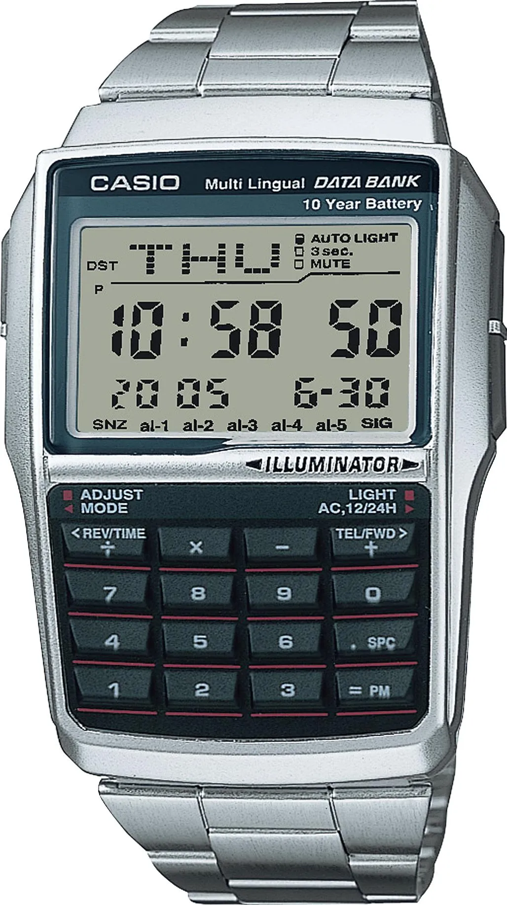 • Электрическая светодиодная подсветка с функцией автоматической подсветки при наклоне часов к лицу. • Записная телефонная книжка для хранения фамилий и номеров телефонов. Максимальная емкость - 25 абонентов. • Одновременное отображение текущего времени в двух разных часовых поясах. • Встроенный 8-ми разрядный калькулятор. Конвертер валют. • Секундомер с точностью показаний 1/100 сек и максимальным временем измерения - 24 час. • 5 программируемых будильников на ежедневный сигнал (только время) и сигнал на определенное время в определенный день (месяц, день и время). • Функция повтора сигнала будильника (Snooze). • Срок службы батареи 10 лет. • Автоматический календарь. • Стекло имеет сферическую поверхность. • Браслет из нержавеющей стали. • Надежный браслетный замок с тройным сгибом.
