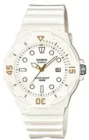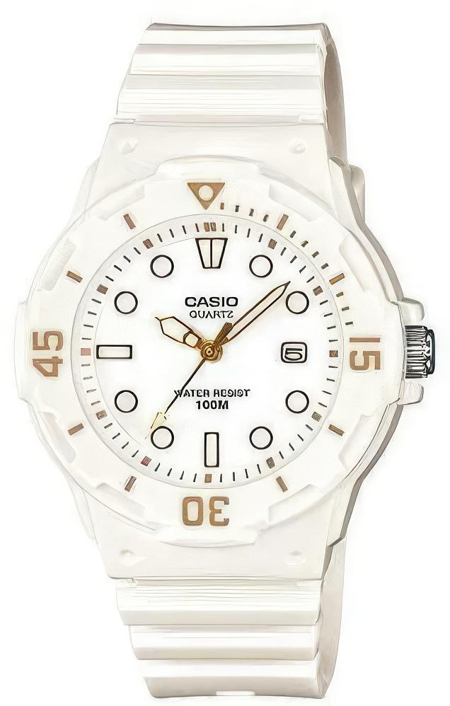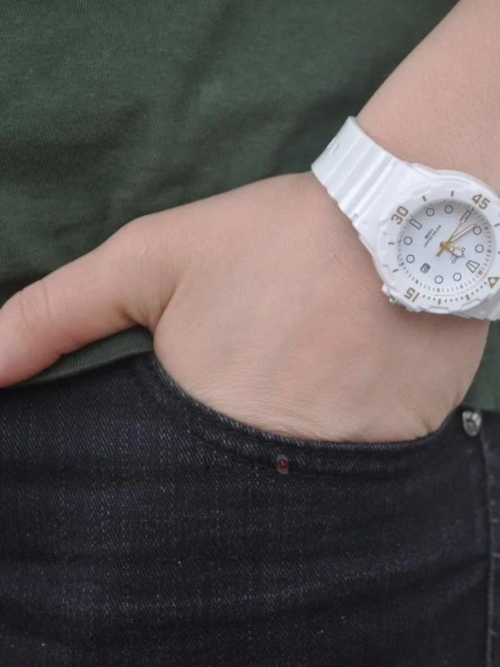 Крупные белые женские наручные часы с кварцевым механизмом. Часы в пластиковом корпусе на силиконовом ремешке. Циферблат белого цвета с крупными маркерами и стрелками.