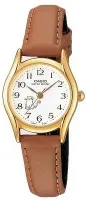 Женские наручные часы в прямоугольном корпусе с позолотой, секундная стрелка центральная, на коричневом кожаном ремешке.