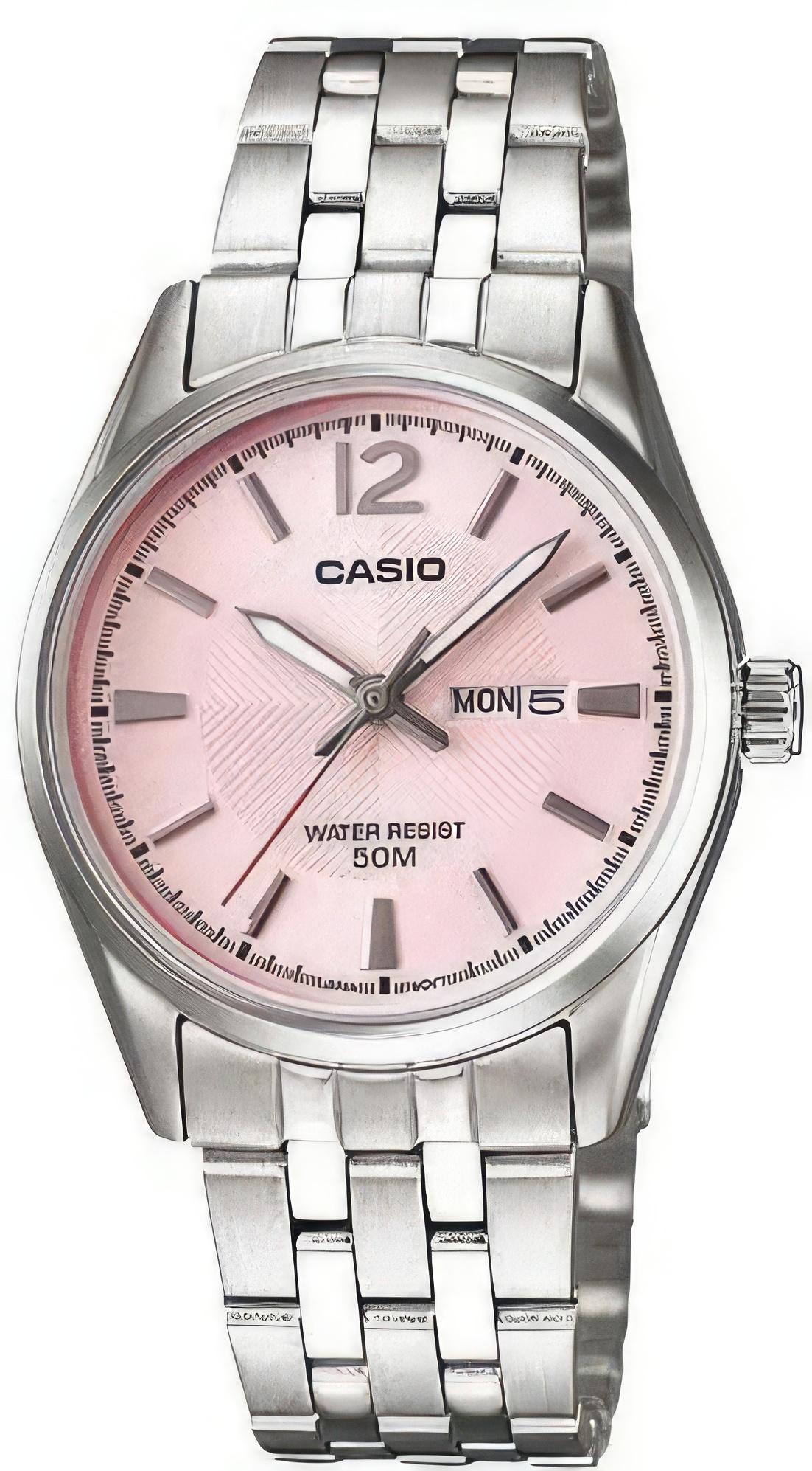 Женские наручные часы Casio Collection LTP-1335D-5A. Точный кварцевый механизм с аналоговой индикацией. Корпус изготовлен из высококачественной нержавеющей стали 316L с высокими антикоррозийными свойствами. На стрелки и отметки нанесен светонакопительный состав, благодаря этому считывать информацию с циферблата возможно и в темноте. На циферблате отображается текущее число месяца и день недели. Браслет из нержавеющей стали. Прочное, устойчивое к царапинам минеральное стекло защищает часы от повреждений. Часы являются водонепроницаемыми до 5 Бар. Цвет корпуса: Серебристый. Цвет циферблата: Розовый. Ширина (с заводной головкой): 30мм. Толщина: 9мм. Гарантия: 2 года.