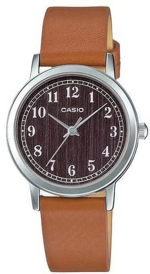 Женские наручные часы. Точный кварцевый механизм. Круглый циферблат коричневого цвета. Минеральное стекло. Индикация арабскими цифрами. Стальной корпус металлического цвета с полированной поверхностью. Кожаный ремешок. Классическая застежка.