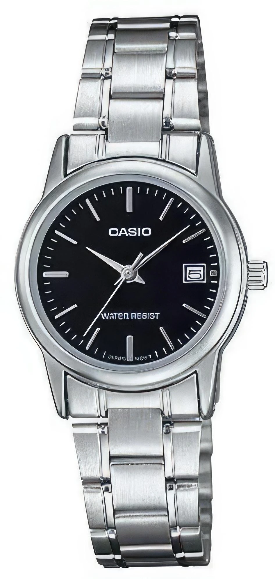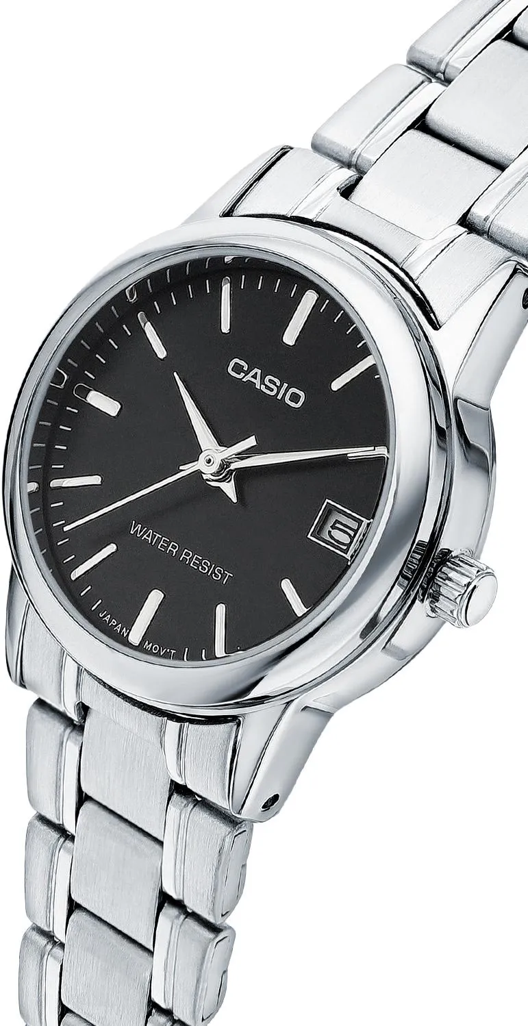 Стальные женские наручные часы в круглом корпусе с центральной секундной стрелкой и окошком даты на черном циферблате.