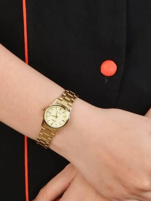 Женские наручные часы выполненные из стального сплава с позолотой, оснащенные индикатором даты, секундная стрелка центральная.