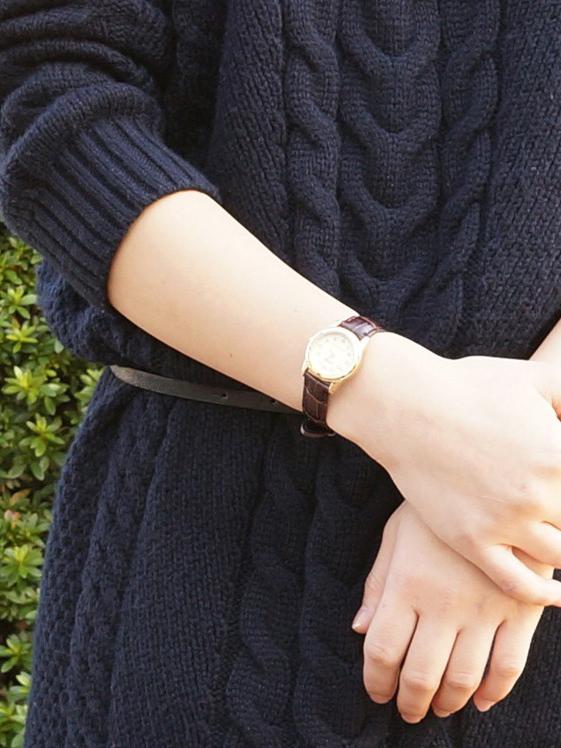 Женские наручные часы в круглом корпусе с позолотой, окошко даты в положении 3 часа, секундная стрелка центральная на светлом циферблате, ремешок кожаный черного цвета.