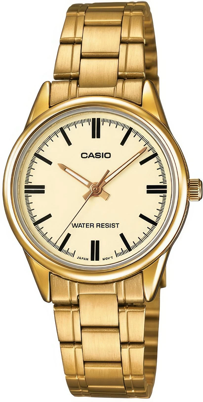 Женские наручные часы, полностью выполненные из стального сплава с позолотой, секундная стрелка центральная в круглом корпусе, вместо цифр риски.