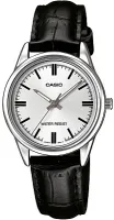 Женские наручные часы в стальном круглом корпусе с центральной секундной стрелкой, вместо цифр риски, на черном кожаном ремешке.