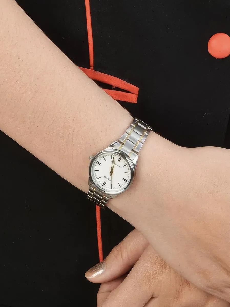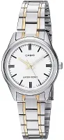 Женские наручные часы Casio Collection LTP-V005SG-7A. Точный кварцевый механизм с аналоговой индикацией. В отличие от механических часов, не требуют завода и работают от батареи, показывая отклонение всего несколько секунд в месяц. На стрелки и отметки нанесен светонакопительный состав, благодаря этому считывать информацию с циферблата возможно и в темноте. Браслет из нержавеющей стали обладает высокой прочностью и износостойкостью, обеспечивая долговечность даже при активной эксплуатации. Материал устойчив к коррозии и сохраняет свой внешний вид надолго. Корпус изготовлен из высококачественной нержавеющей стали 316L с высокими антикоррозийными свойствами. Прочное, устойчивое к царапинам минеральное стекло защищает часы от повреждений. Часы являются водонепроницаемыми до 3 Бар. Цвет корпуса: Серебристый. Цвет циферблата: Белый. Толщина: 8 мм. Гарантия: 2 года. Другие наименования модели: LTP-V005SG-7AUDF.