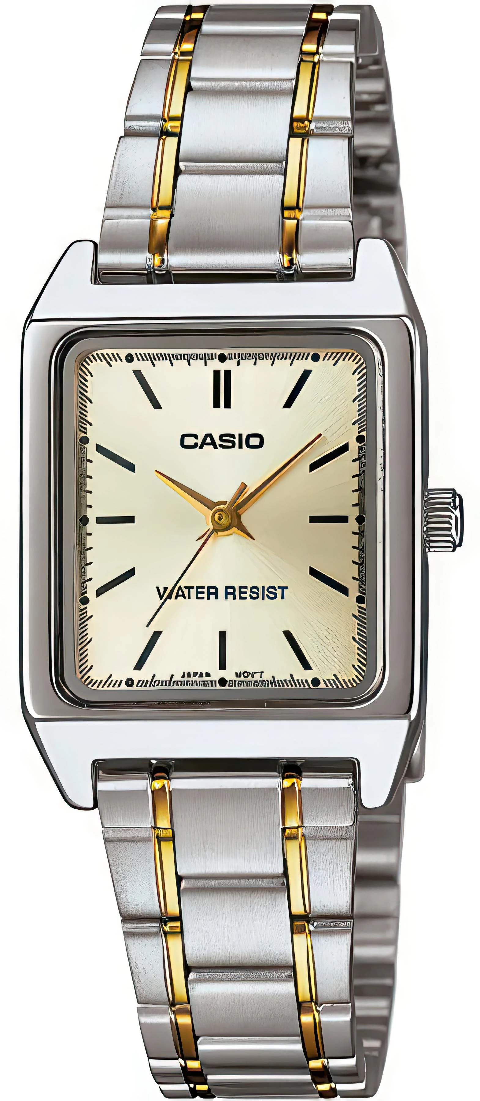 Женские часы в классическом стиле. Доступная цена. Прямоугольный металлический корпус и стальной браслет с частичным IP-покрытием цвета золота. Минеральное стекло. Японский кварцевый механизм.