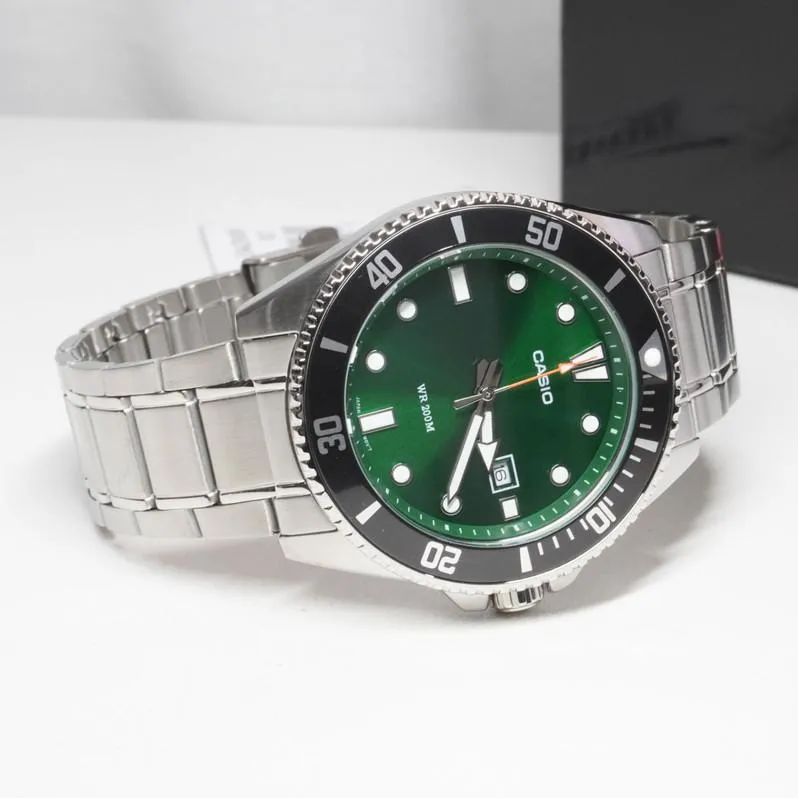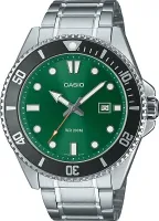 Мужские наручные часы Casio Collection MDV-107D-3A2. Точный кварцевый механизм с аналоговой индикацией. Браслет из нержавеющей стали. После настройки автоматический календарь всегда отображает точную дату. Аккумулятор обеспечивает часы достаточным питанием приблизительно на 3 года. Браслет из нержавеющей стали. Браслет изготовлен из алюминия. Прочное, устойчивое к царапинам минеральное стекло защищает часы от повреждений. На циферблате отображается текущее число месяца. Часы являются водонепроницаемыми до 20 Бар. Цвет циферблата: Серебристый. Цвет циферблата: Черный. Цвет корпуса: Зеленый. На стрелки и отметки нанесен светонакопительный состав, благодаря этому считывать информацию с циферблата возможно и в темноте. Высота (с ушками): 50 мм. Толщина: 12 мм. Гарантия: 2 года.