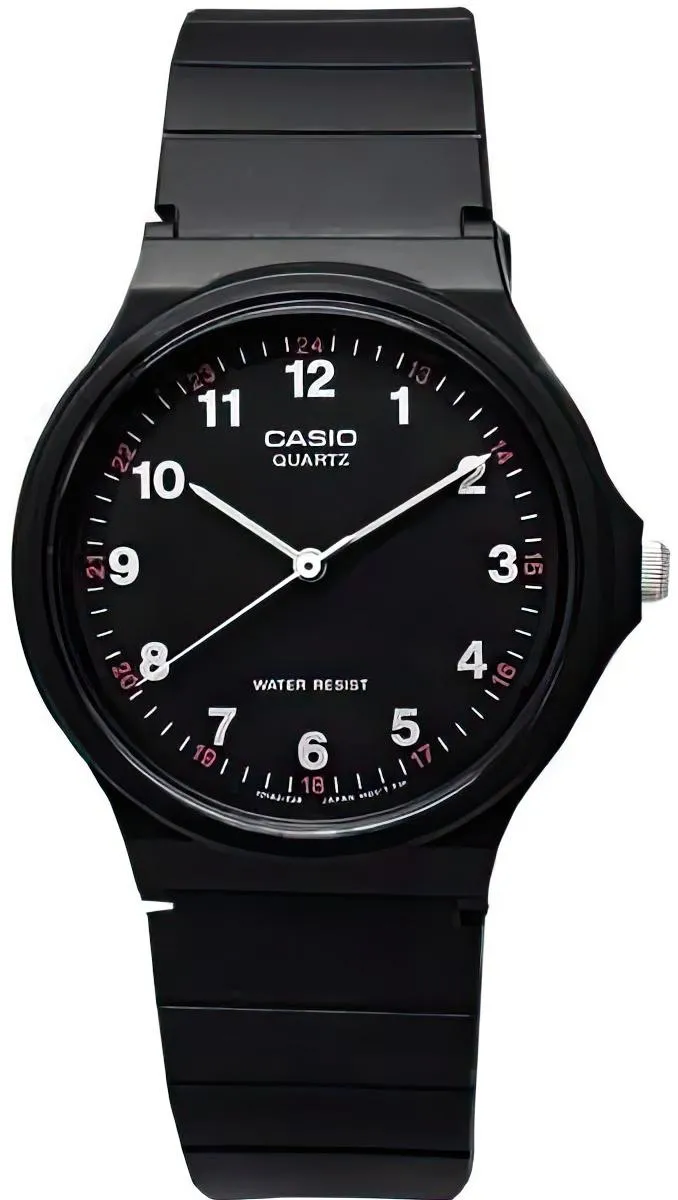 Кварцевые наручные часы в классическом исполнении, корпус пластиковый круглой формы, секундная стрелка центральная на черном циферблате.