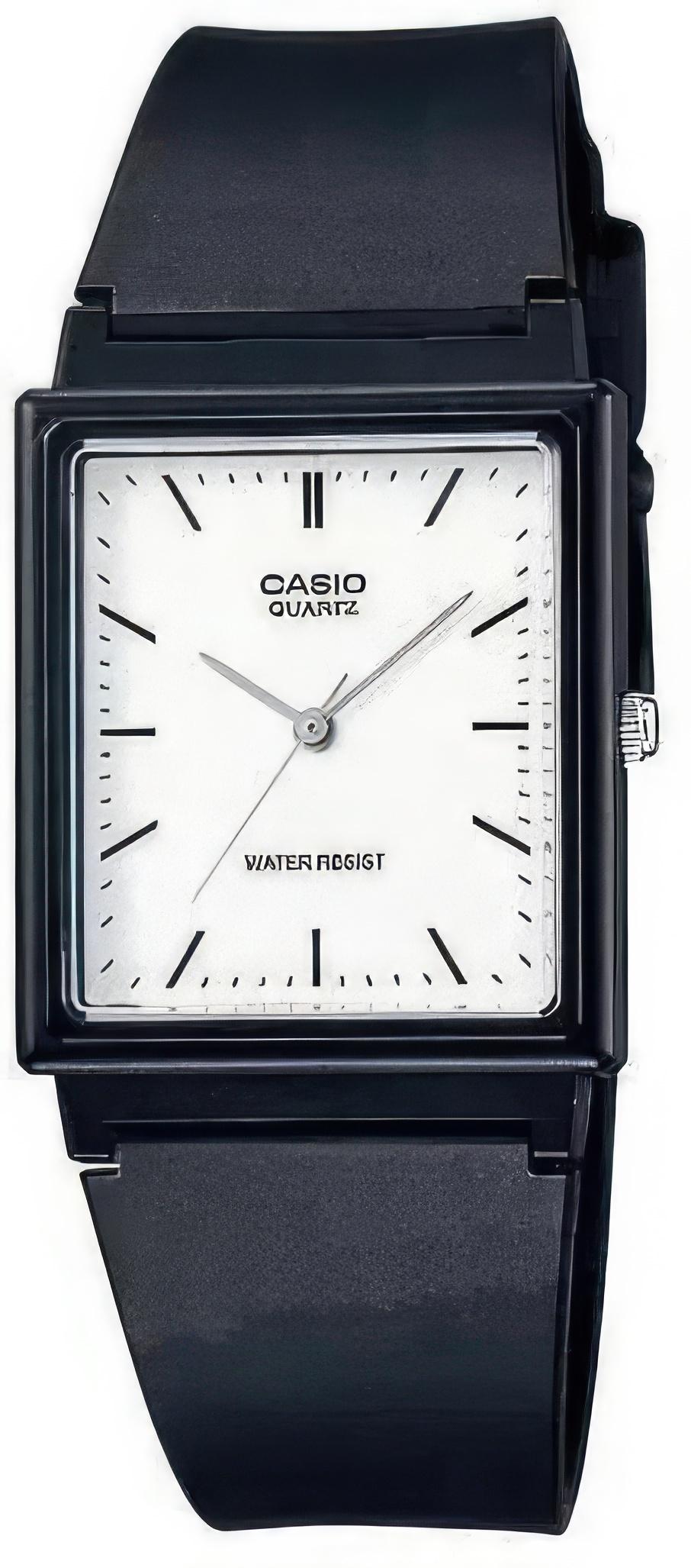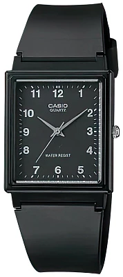 Наручные часы с центральной секундной стрелкой в прямоугольном пластиковом корпусе на пластиковом ремешке.