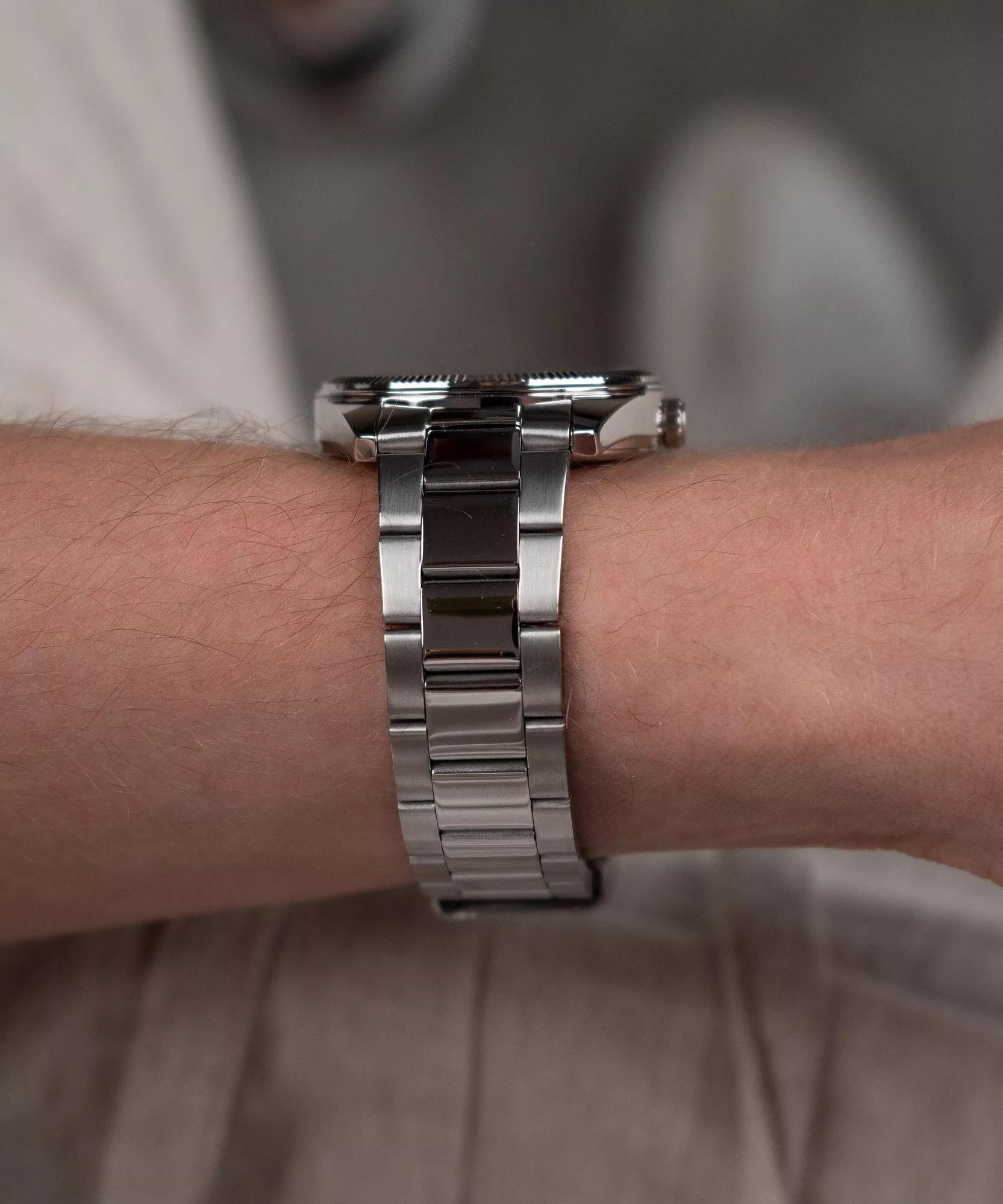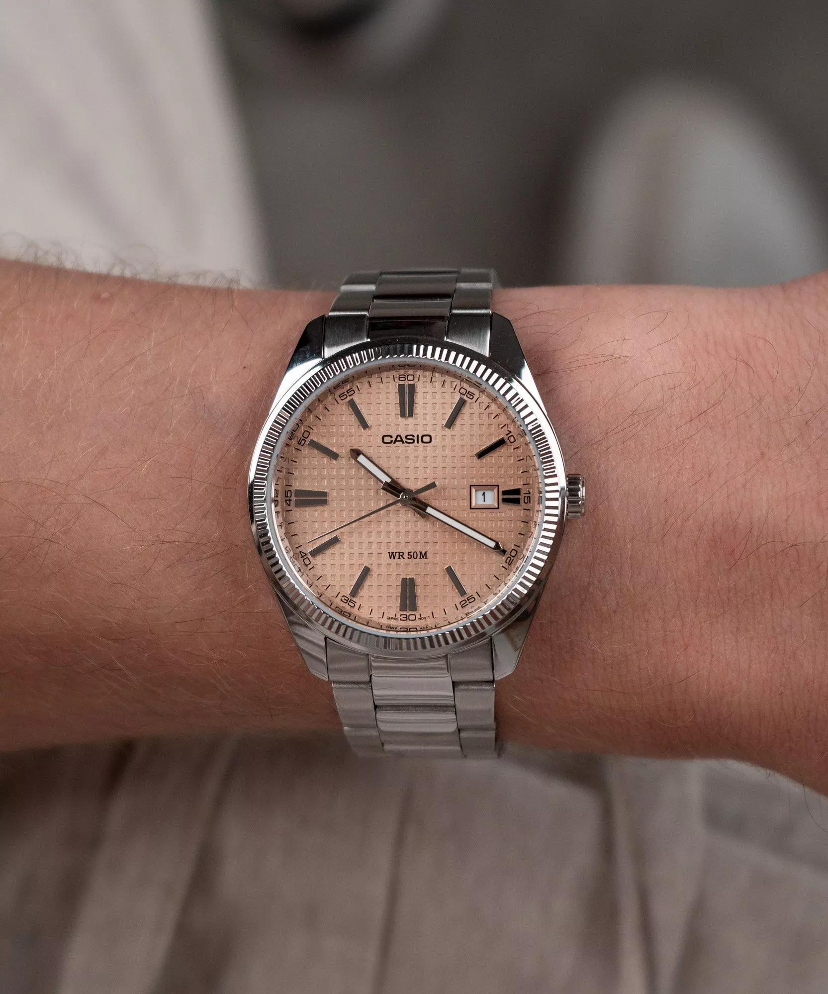 . Точный кварцевый механизм с аналоговой индикацией. Браслет из нержавеющей стали. После настройки автоматический календарь всегда отображает точную дату. Браслет из нержавеющей стали. Прочное, устойчивое к царапинам минеральное стекло защищает часы от повреждений. На циферблате отображается текущее число месяца. Часы являются водонепроницаемыми до 5 Бар. Цвет циферблата: Серебристый. Цвет корпуса: Бежевый. На стрелки и отметки нанесен светонакопительный состав, благодаря этому считывать информацию с циферблата возможно и в темноте. Высота (с ушками): 44 мм. Толщина: 9 мм. Гарантия: 2 года.