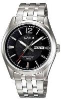Мужские наручные часы в классическом исполнении с окошком даты и днем недели на стальном браслете.