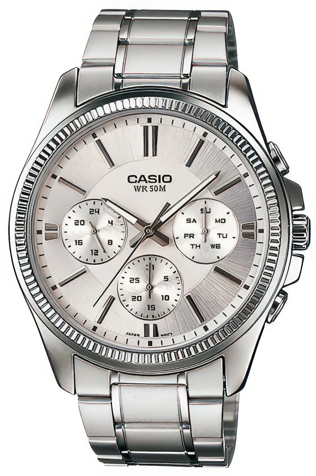 Мужские наручные кварцевые часы, полностью выполненные из стального сплава, в корпусе круглой формы, стрелочные указатели даты, дня недели и времени суток, секундная стрелка центральная.