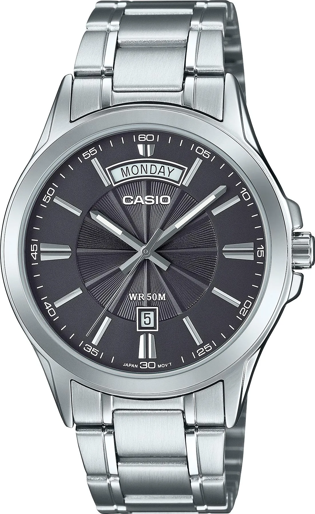 Мужские кварцевые часы в корпусе из нержавеющей стали с черным циферблатом. Модель оснащена центральными стрелками и удобным окном с отображением даты и дня недели. Прочное минеральное стекло и водостойкость 50 метров (WR 50) защищают от брызг, дождя и мелких повреждений. Стальной браслет с раскладывающейся застежкой обеспечивает комфортную посадку. Вес модели — 104 грамма, срок службы батарейки — до 3 лет.