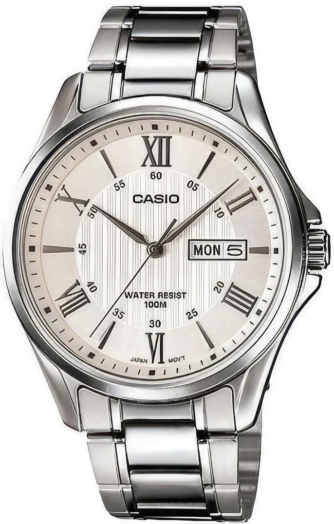 Мужские наручные часы Casio Collection MTP-1384D-7A. Точный кварцевый механизм с аналоговой индикацией. Корпус изготовлен из высококачественной нержавеющей стали 316L с высокими антикоррозийными свойствами. На циферблате отображается текущее число месяца и день недели. Браслет из нержавеющей стали. Прочное, устойчивое к царапинам минеральное стекло защищает часы от повреждений. Часы являются водонепроницаемыми до 10 Бар. Цвет корпуса: Серебристый. Ширина (с заводной головкой): 47мм. Толщина: 10мм. Гарантия: 2 года.