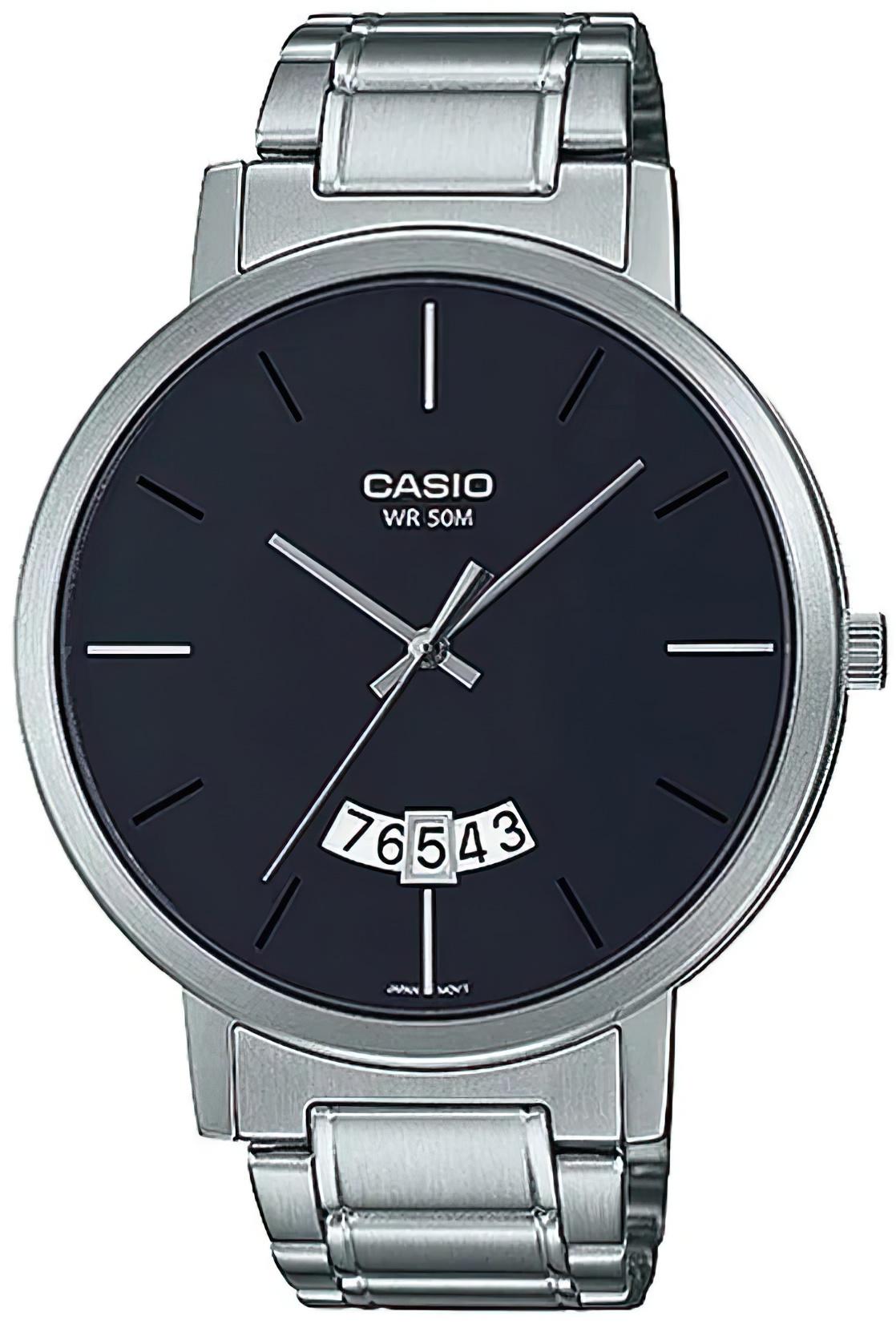 Мужские наручные часы Casio Collection MTP-B100D-1E. Точный кварцевый механизм с аналоговой индикацией. Корпус изготовлен из высококачественной нержавеющей стали 316L с высокими антикоррозийными свойствами. На циферблате отображается текущее число месяца. Браслет из нержавеющей стали. Прочное, устойчивое к царапинам минеральное стекло защищает часы от повреждений. Часы являются водонепроницаемыми до 5 Бар. Цвет корпуса: Серебристый. Цвет циферблата: Черный. Гарантия: 2 года.