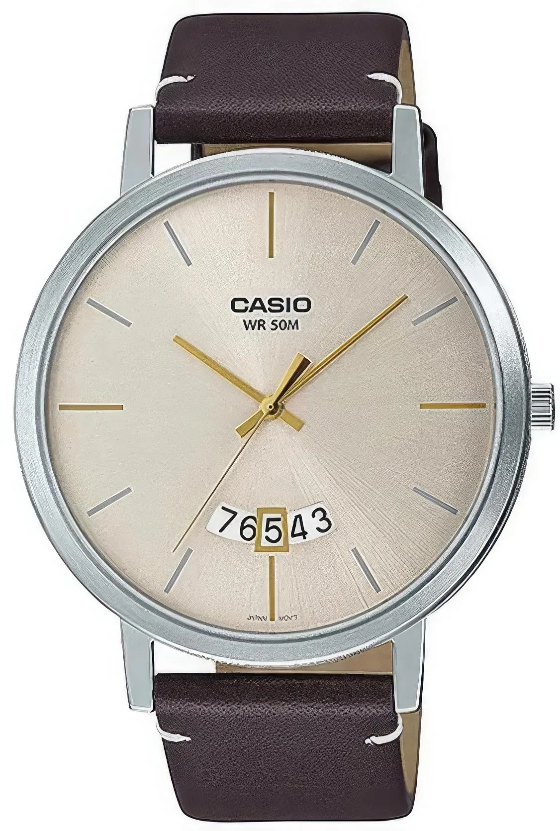Мужские наручные часы Casio Collection MTP-B100L-9E. Точный кварцевый механизм с аналоговой индикацией. Корпус изготовлен из высококачественной нержавеющей стали 316L с высокими антикоррозийными свойствами. На циферблате отображается текущее число месяца. Ремешок изготовлен из кожи. Прочное, устойчивое к царапинам минеральное стекло защищает часы от повреждений. Часы являются водонепроницаемыми до 5 Бар. Цвет корпуса: Серебристый. Цвет циферблата: Бежевый. Гарантия: 2 года.
