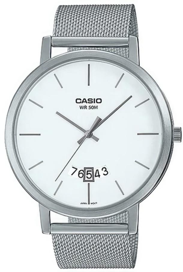 Мужские наручные часы Casio Collection MTP-B100M-7E. Точный кварцевый механизм с аналоговой индикацией. Корпус изготовлен из высококачественной нержавеющей стали 316L с высокими антикоррозийными свойствами. На циферблате отображается текущее число месяца. Браслет из нержавеющей стали. Прочное, устойчивое к царапинам минеральное стекло защищает часы от повреждений. Часы являются водонепроницаемыми до 5 Бар. Цвет корпуса: Серебристый. Цвет циферблата: Белый. Гарантия: 2 года.