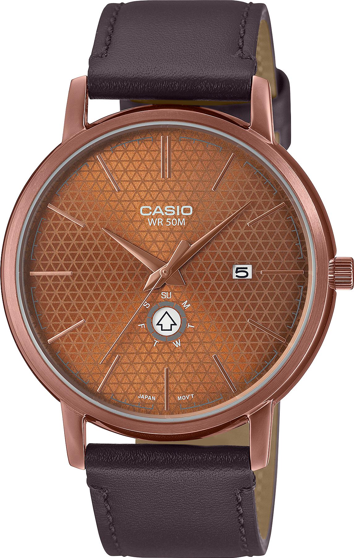 Мужские наручные часы Casio Collection MTP-B125RL-5A. Точный кварцевый механизм с аналоговой индикацией. Ремешок изготовлен из кожи. Аккумулятор обеспечивает часы достаточным питанием приблизительно на 3 года. Браслет из нержавеющей стали. Прочное, устойчивое к царапинам минеральное стекло защищает часы от повреждений. На циферблате отображается текущее число месяца и день недели. Часы являются водонепроницаемыми до 5 Бар. Цвет циферблата: Коричневый. Цвет корпуса: Коричневый. Толщина: 8 мм. Гарантия: 2 года.